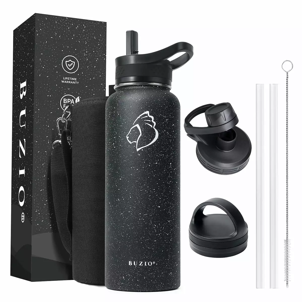 Buzio 40 oz Starry Black Stainless Steel Water Bottles with Straw and 3 Lids Insulated Travel Cup with Strap for Hot and Cold Drinks