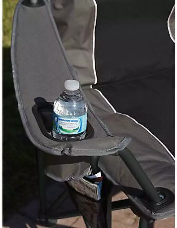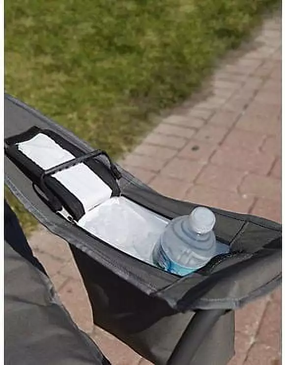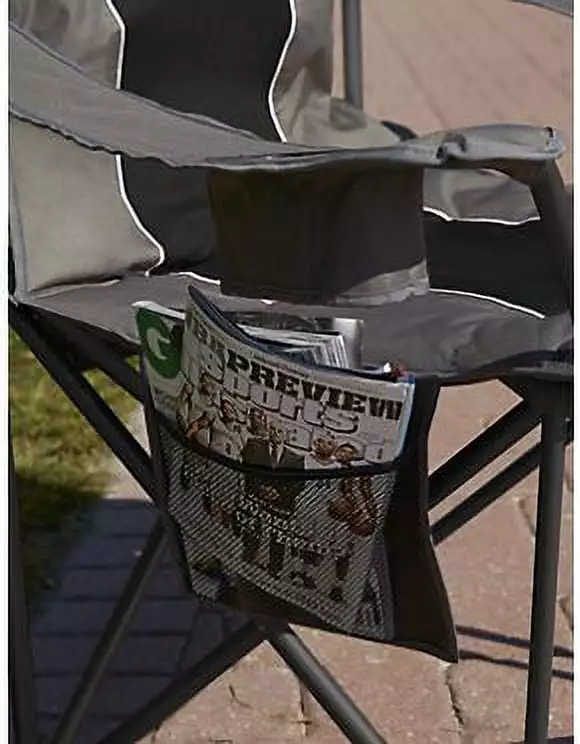 1.000-lb. stationary weight capacity*. Additional center frame support ensures durability and support. Rigid components stand up to the stress of normal use. Heavy-duty. super sturdy 22mm tubed frame. High quality. fully padded 600-denier polyester fabric distributes weight evenly across frame. Oversize shatter-proof nylon feet provide traction for added stability. Drawstring mesh pocket (approx. 14"w x 15"l) attached to chair back stores handy essentials. Left armrest has zippered cooler. Right armrest has oversize gadget/cup holder. lower mesh side pocket. Includes drawstring storage/tote bag with shoulder sling. Seat: 26.5"w x 23"d; seat height (from floor): 20". Backrest size: 25.5"w x 23"h; back height (from ground): 42.25". Weighs approx. 15 lbs.