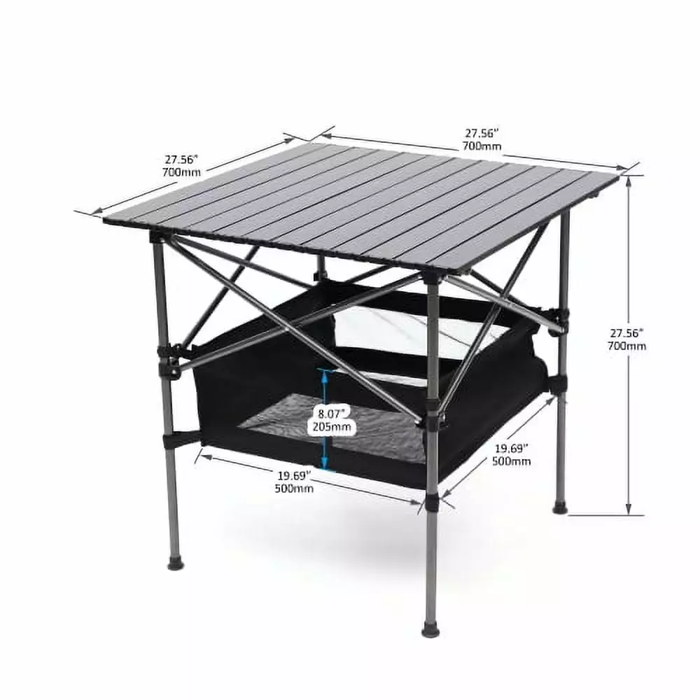 Product Features 1.Packing: 1 pcs /ctn 2.Item Dimensions: 27.56"L x 27.56 "W x 27.56 "H. Load-bearing capacity:120lbs 3.Material:The square table is made of high-quality aluminum. making it lightweight and easy to carry. 4.The premium durable high-quality materials used in the table’s construction ensure that it is sturdy and long-lasting. while the waterproof and stain-resistant surface makes it easy to maintain. 5.Exquisite Details: The roll-up table-top can be easy to fold for carrying. 6.The convenient storage basket underneath the table-top is a unique feature that makes it easy to store small items such as garden tools. toys. and mobile phones. 7.Versatile Use:The Lightweight table can be used as an outdoor. indoor dining table. BBQ table. laptop table. or gaming table. making it suitable for a variety of outdoor activities. 8.Easy Installation: The table is easy to assemble and detachable. It can be easily folded and stored in a matching handbag. making it easy to carry with you wherever you go.1-piece Folding Outdoor Table with Carrying Bag.Lightweight Aluminum Roll-up Square Table for indoor. Outdoor Camping. Picnics. Beach.Backyard. BBQ. Party. Patio. 27.56X27.56X27.56in. Black