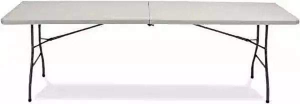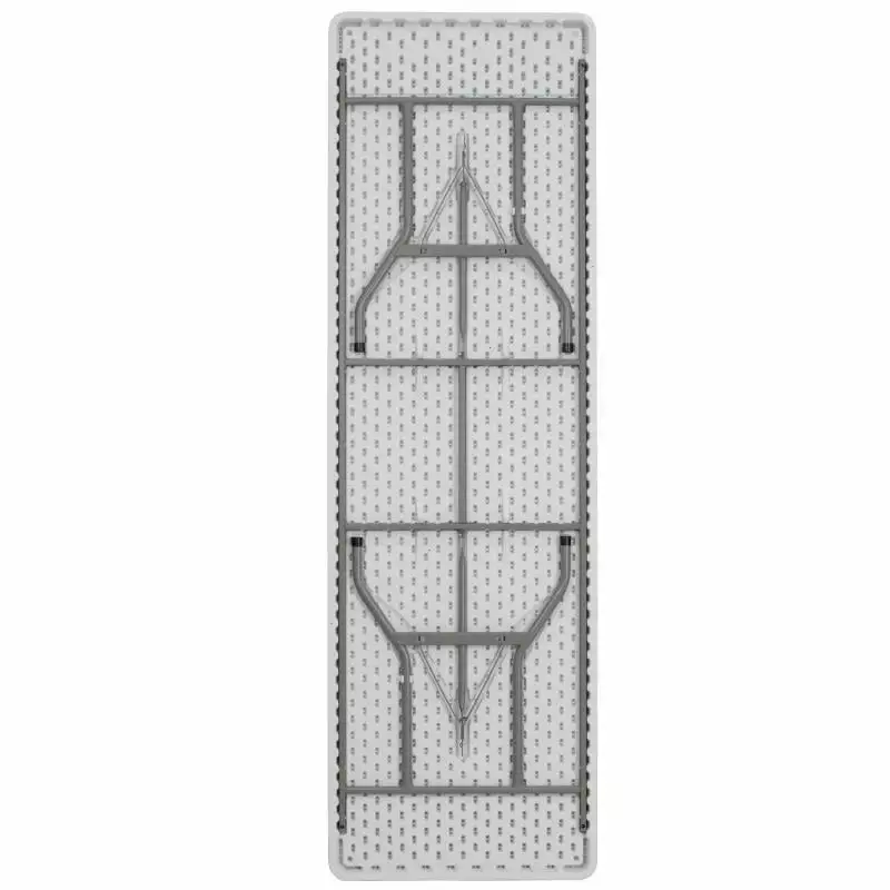 Set of 10 tables. Commercial grade folding table that is designed to withstand the test of time! 30”W x 96”L Folding Table features a durable stain resistant blow molded top and sturdy frame. The blow molded top is super low maintenance and cleans easily. This 8 ft. table locks in place in a SNAP with the leg locking system for easy set-ups. This table can be used as a temporary seating solution or set-up in a permanent location for everyday use. Commercial Grade Folding Table 600 lb. Static Load Capacity 1.75” Thick Granite White Table Top Impact and Stain Resistant Plastic Top Gray Powder Coated Wishbone Legs Non-Marring Foot Caps Made of Eco-Friendly Materials High Quality Construction Constructed for Indoor and Outdoor Use Shipping Weight: 60 lbs. Overall Width: 30”W Overall Depth: 96”D Overall Height: 29”H Weight Capacity: 600 lbs.