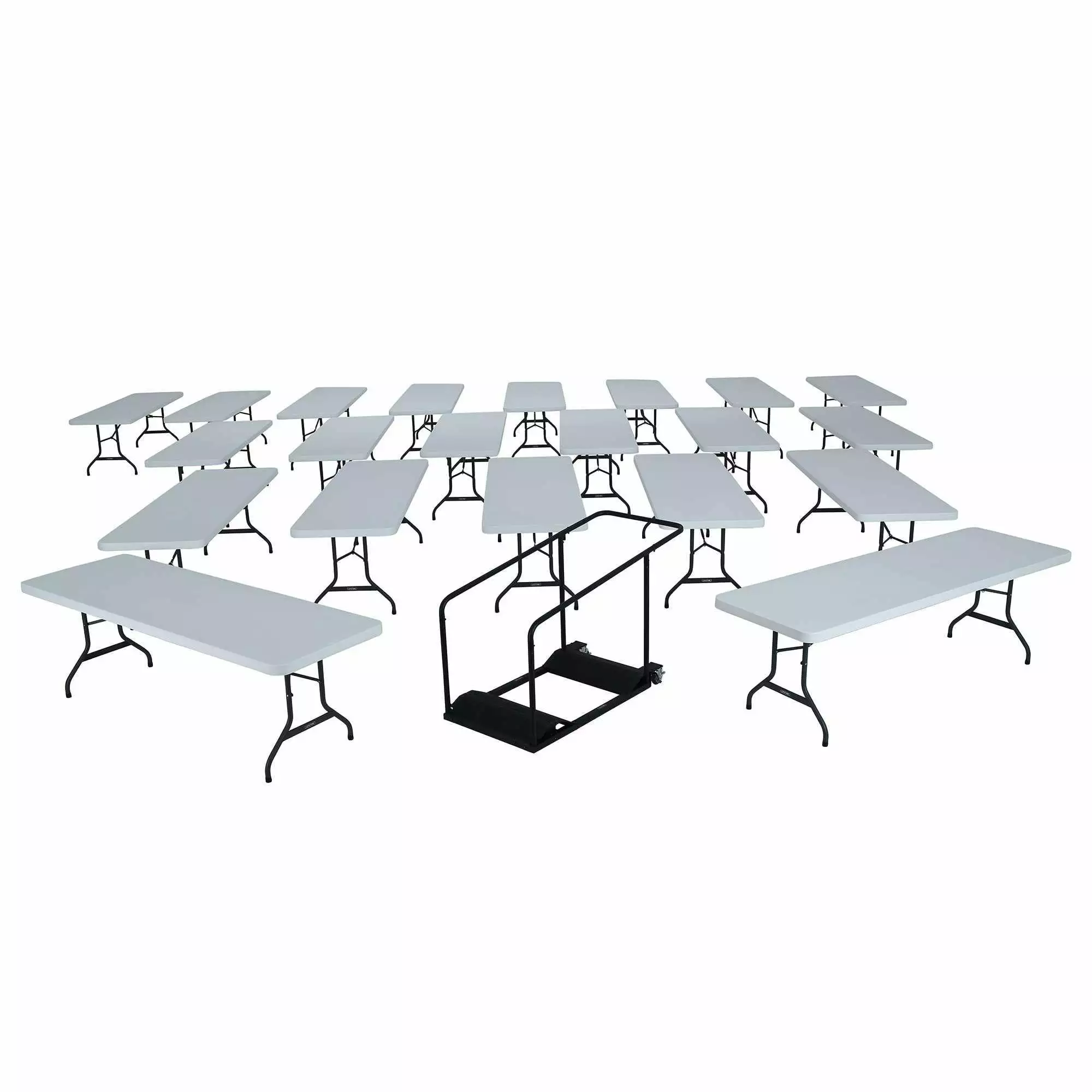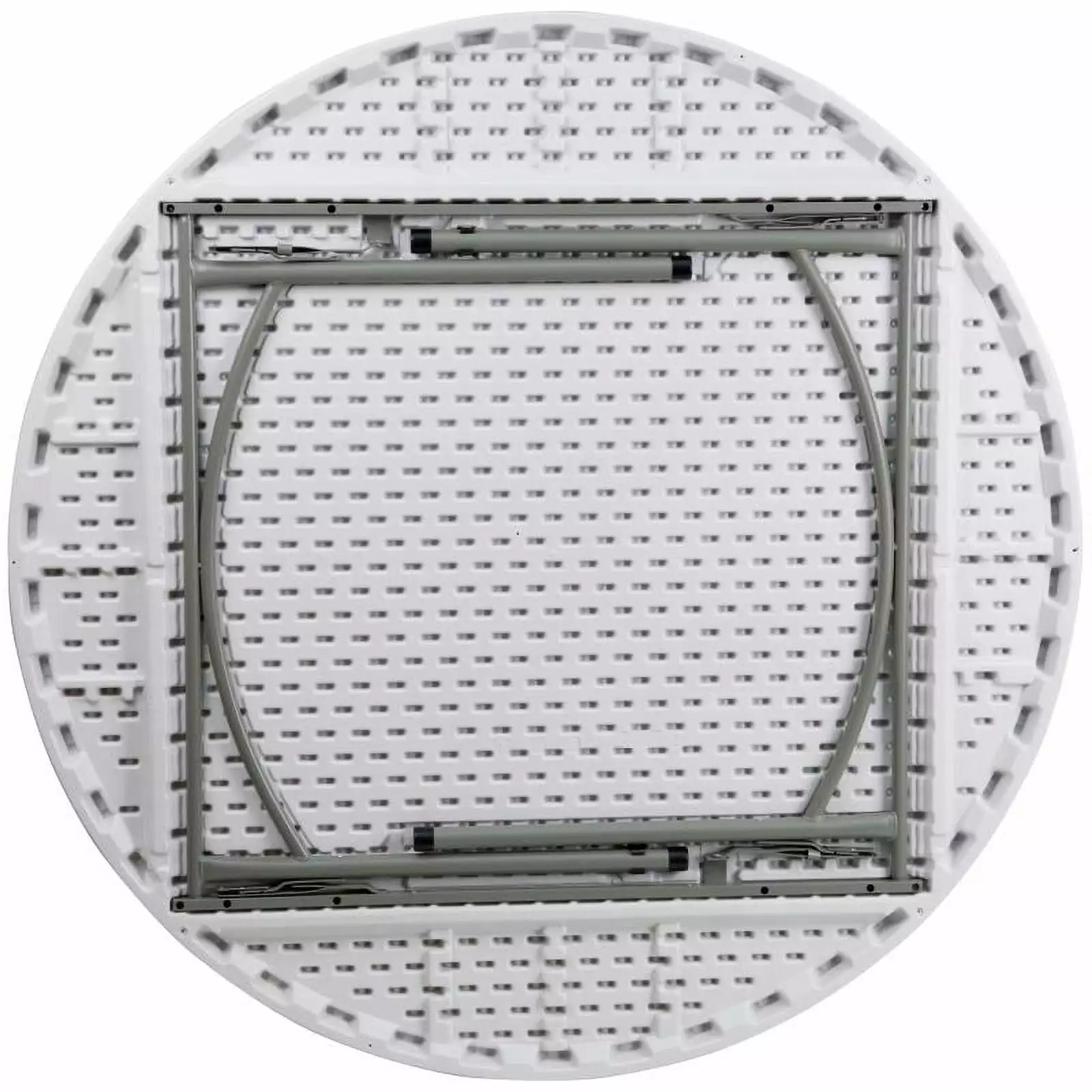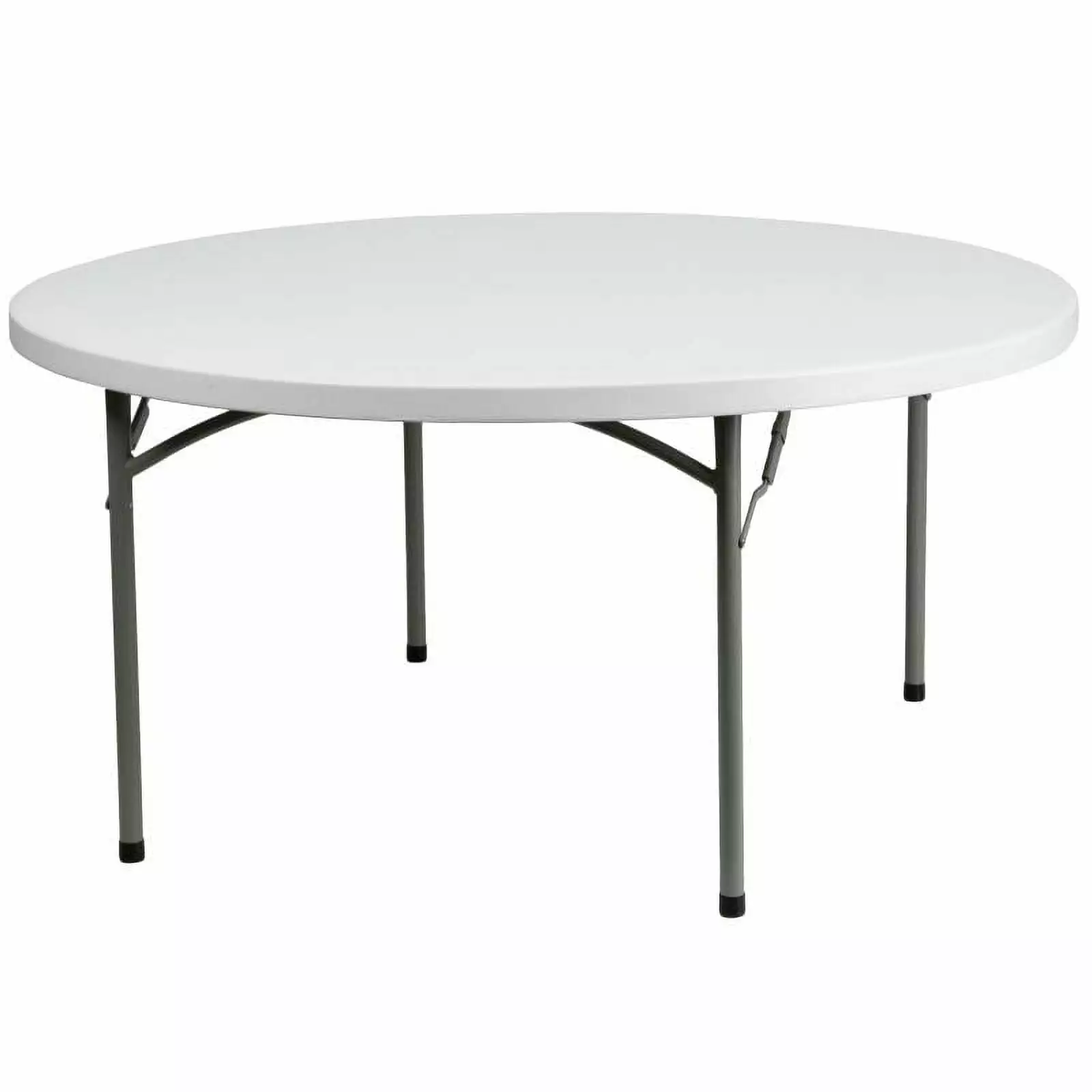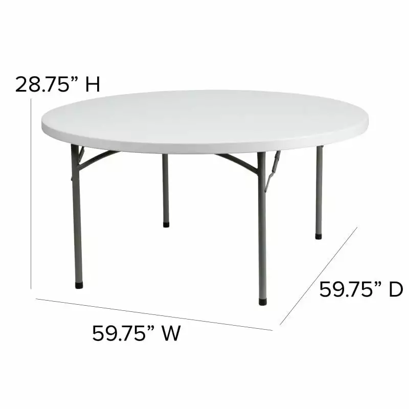 Set of 10 tables . Ensure you have enough surface space for any function and take the stress out of hosting your next gathering. The round dining folding table is a great option for special event planners. catering companies and banquet facilities. This durable. easy to clean table is commercial rated for use in banquet halls. convention centers and at trade shows. Use during game night. dress it up for holiday parties. and coordinate crafts night. The thick. granite white tabletop is 60" in diameter. 2" thick. and will comfortably seat up to 6-8 adults. Its waterproof. impact and stain resistant top have a 600 pound static load capacity. Attractive gray powder coated legs lock securely in place while in use and non-marring floor caps protect your floor by sliding smoothly when you need to move the table. Designed for both indoor and outdoor use. store table indoors and protect the frame from extreme moisture. The 60" Round Granite White Plastic Folding Table is a convenient option for your next home. school or business event. Ready To Use Commercial Table 5′ Folding Table Seats up to 6-8 Adults 600 lb. Static Load Capacity 2" Thick Granite White Top is waterproof. impact and stain resistant Gray Powder Coated Locking Legs with protective floor caps Legs fold underneath top for flat storage Single Unit Weight: 45 lbs Fixed Width: 59.75 Inches Fixed Depth: 59.75 Inches Fixed Height: 28.75 Inches Fixed Leg Width: 1 Inches Fixed Leg Height: 27.36 Inches Weight Capacity: 600 lbs 1 Year Warranty