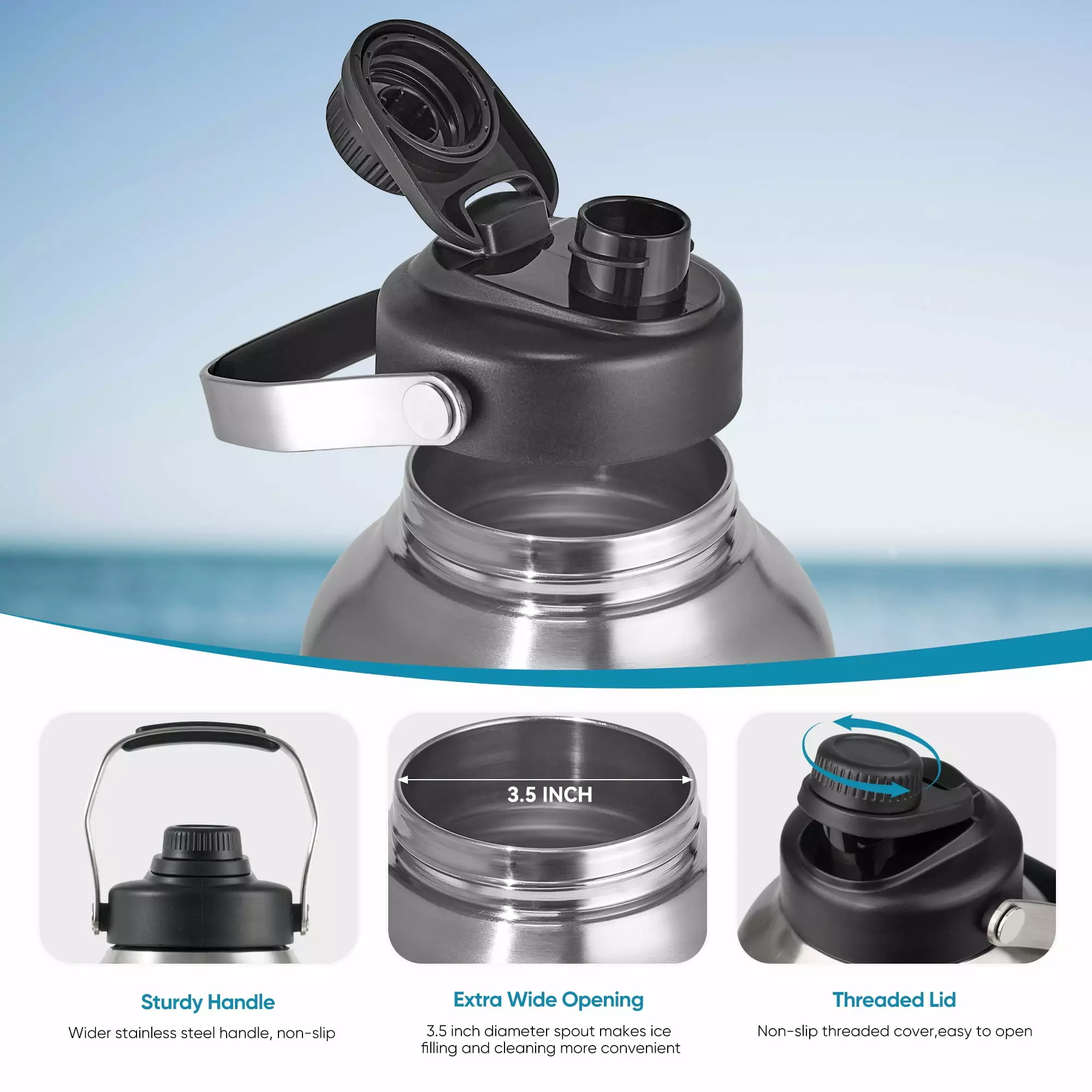 - [Easy to carry and clean] The cover is equipped with a handle that is convenient for outdoor use. and a stainless steel handle that can rotate 360 ??. The lid is fully sealed and will not leak when closed. The 3.5 inch ultra wide opening design makes it extremely easy to clean the bottle and add ice cubes.