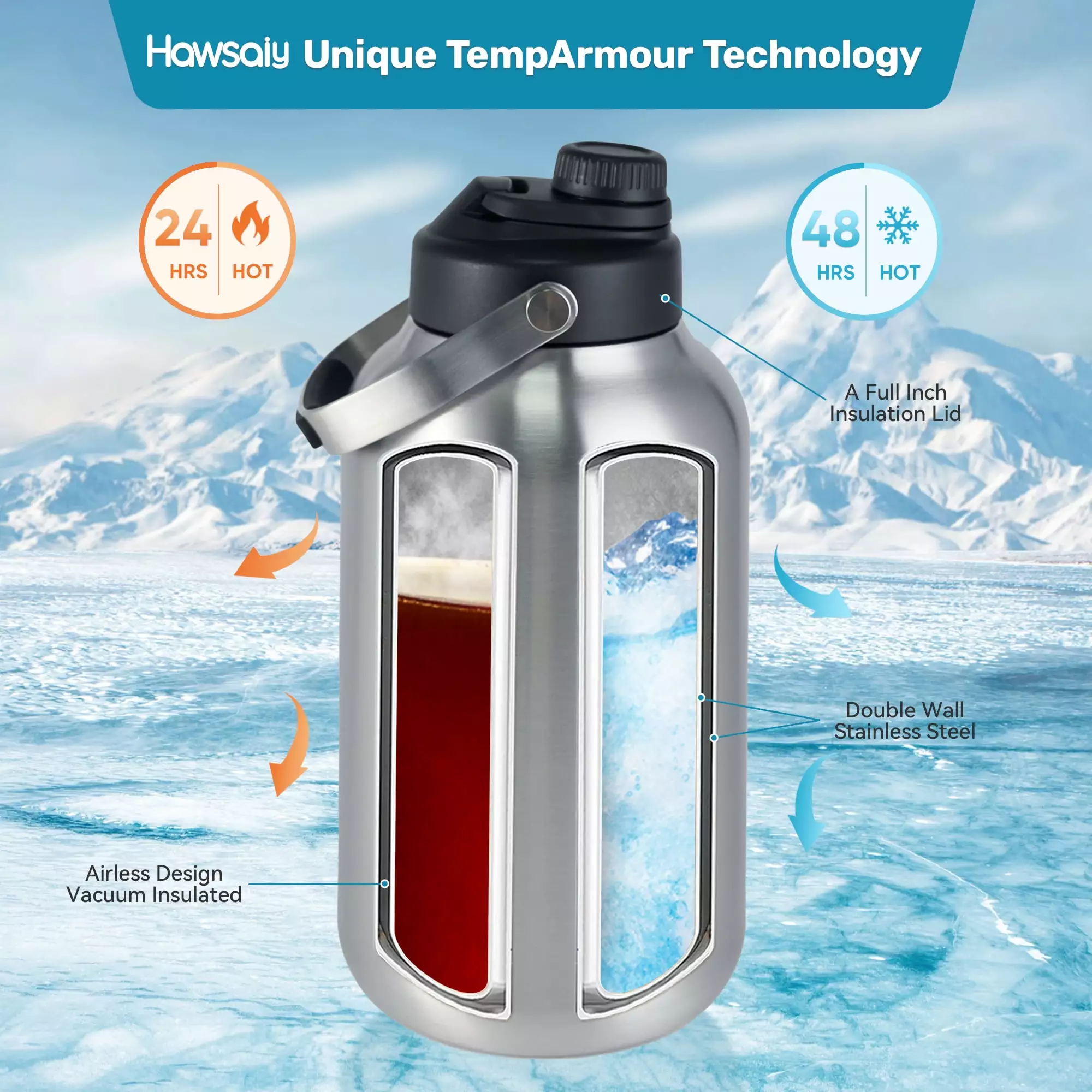 This double-layer insulated bottle keeps beverages hot for 24 hours and cold for 48 hours. It’s completely free of BPA. lead. and PAES. ensuring no metallic taste.With a generous 128oz capacity. this water bottle is perfect for all-day outdoor adventures. helping you stay refreshed in the heat.Its user-friendly design includes a handle for easy outdoor use and a 360° rotating stainless steel handle. The fully sealed lid prevents leaks. and the 3.5-inch wide opening makes cleaning and adding ice cubes a breeze.Choose from a variety of sizes and high-end colors to suit different occasions. all with a durable. non-peeling color coating that’s safe for use.