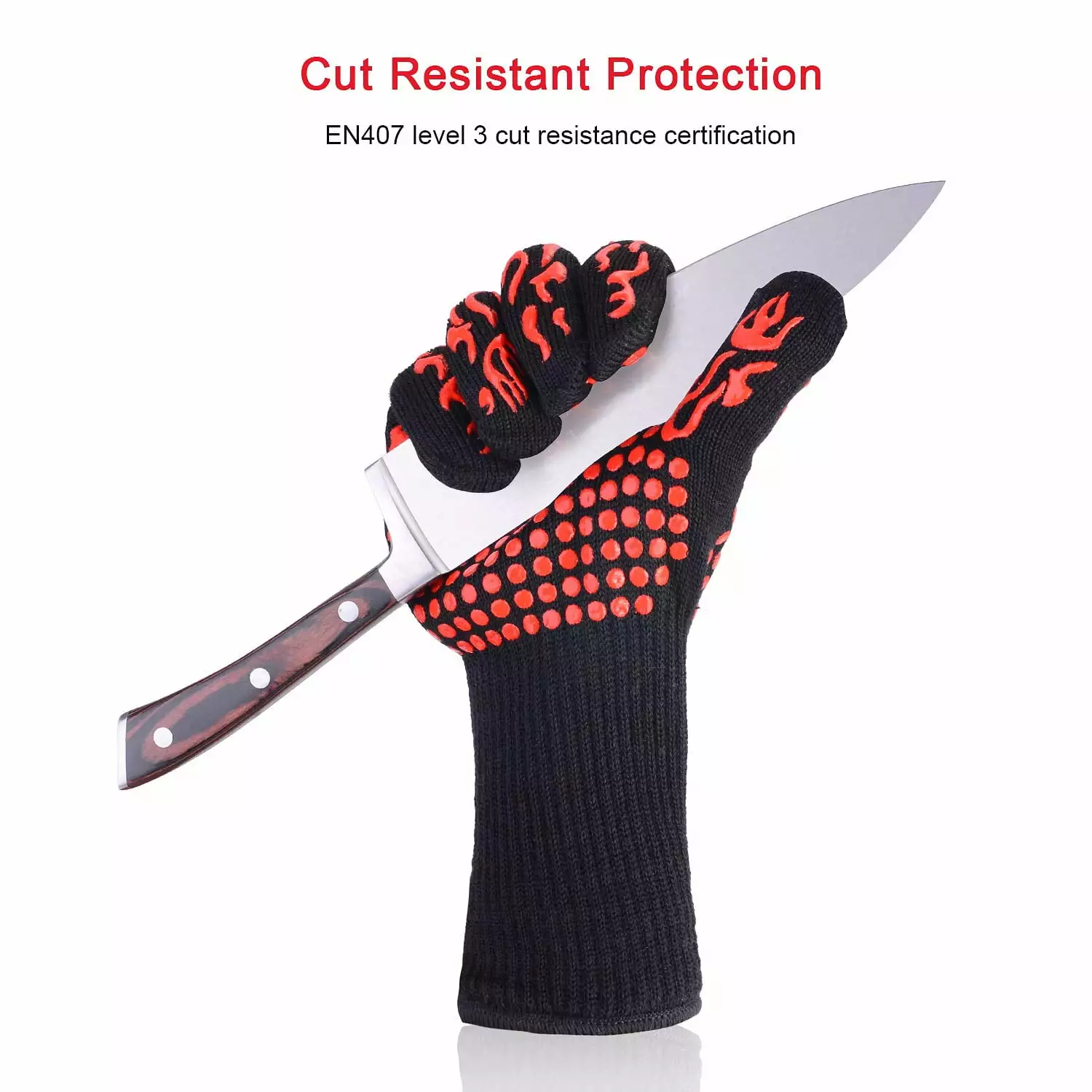 - ??1472??F Heat Resistant & Extra Long Wristbands??FIREOR Barbecue gloves are mainly made of newest Deyan aramid fabric imported from Germany which passed EN407/CE certification. It can withstand temperature up to 1472??F(800??C) last for 7 to 10 seconds. 12.6-inch-long barbecue gloves with 5.5-inch sleeves to protect arms and wrists. not just hands. Provides safer protection for you when grilling or smoking food.