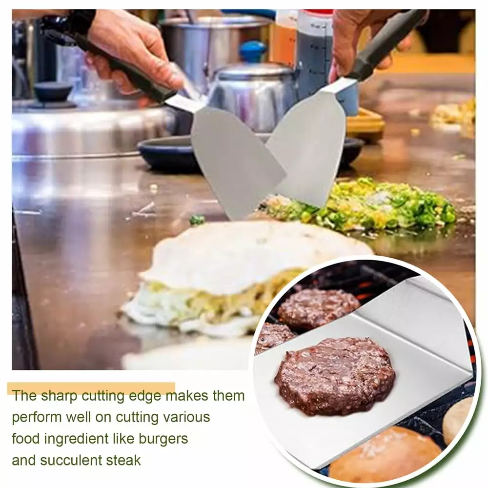 - ??Chef’s Choice griddle accessories kit??This grill tools set with griddle scraper. spatulas and oil bottles helps you to grill as easily as a restaurant chef. Great for flipping burgers. pancakes. veggies. cutting bread.meat and sausage. scraper & chopper to dice food and scrape griddles clean. The Long Griddle Spatula can move large amounts of food quickly and accurately. Egg rings and pepper shakers to enhance your griddle cooking experience.