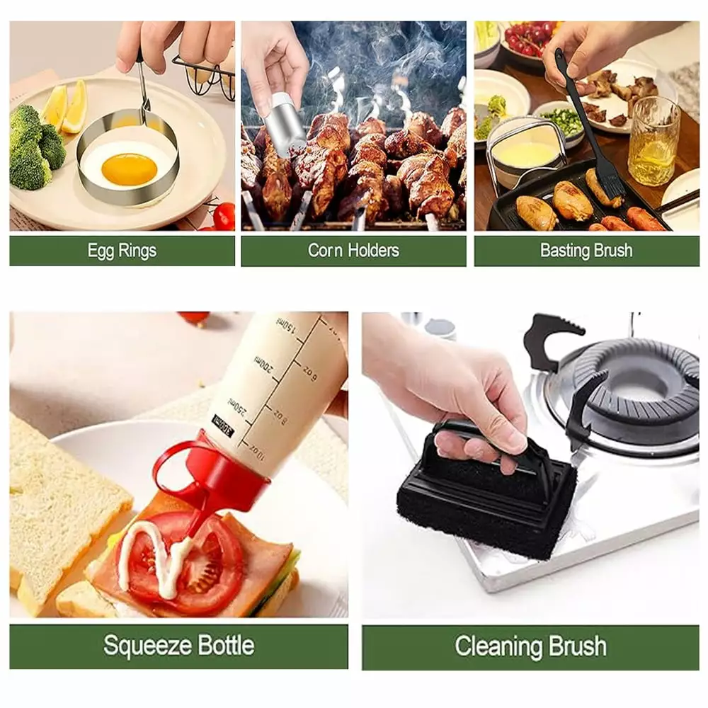 - ??Perfect 18pcs BBQ Accessories??This griddle accessories kit includes: 1* long griddle spatula. 1* slotted spatula. 1* burger flipper. 1* slant edge scraper. 1* meat fork. 1* dry pan tong. 2* sauce bottles. 1* graduated chopping scraper. 2* egg rings. 1* grill cleaning crush. 2* salt and pepper shakers. 1* sauce brush. 1* pan lid. 1* carrying bag. 1* gift box.