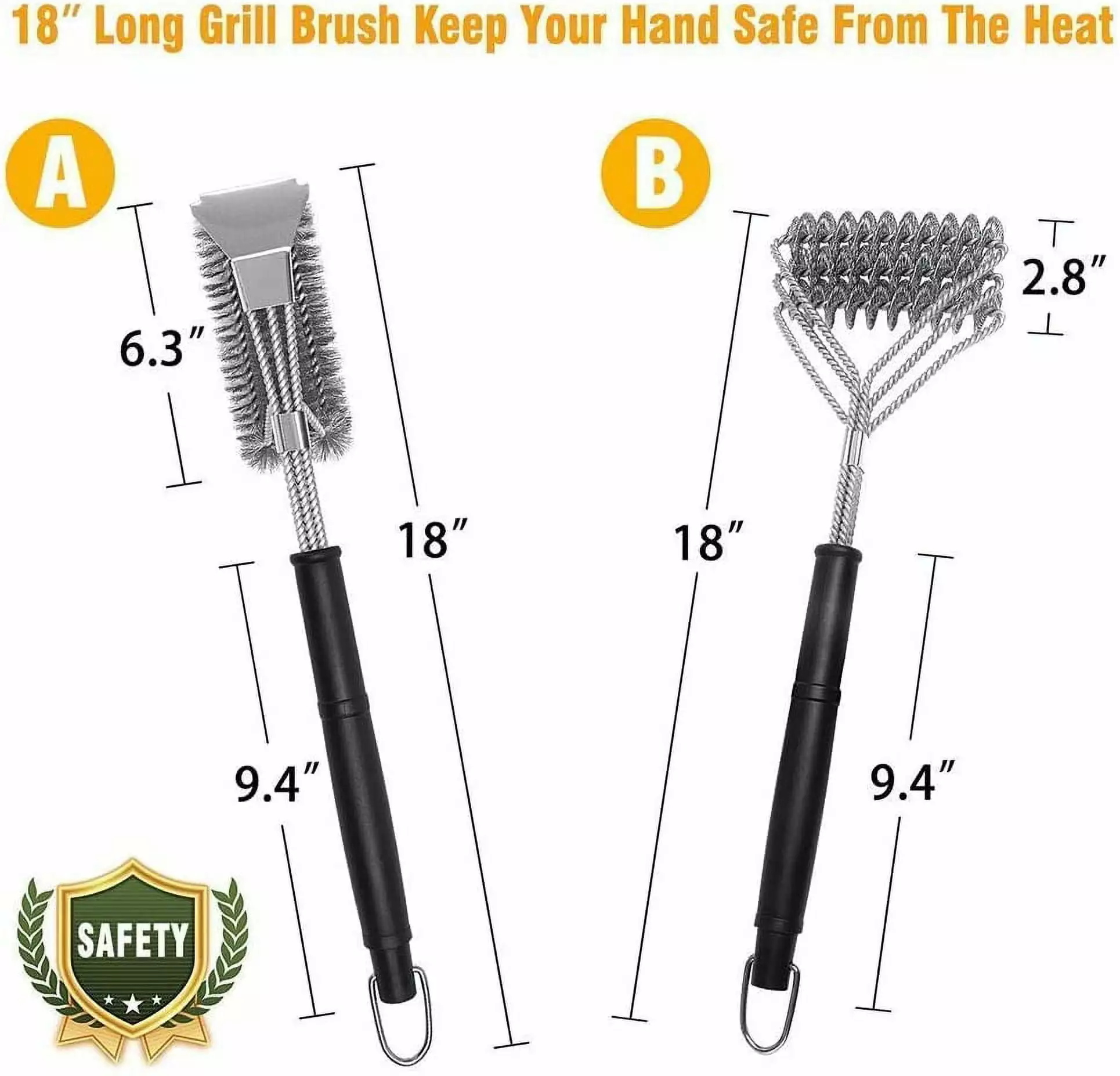 - Extra-long Handle: As we all know. the grill grate has the best cleaning effect when there is residual temperature. The handles of these 18 inch BBQ brushes are 9.4 inches. which allows you to do cleaning work at an absolutely safe distance. keep away from the heat! The plastic handle is ergonomically designed for a comfortable grip and easy work.