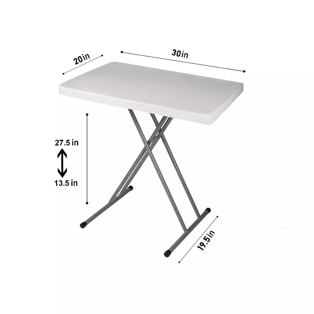 This durable table is designed for working. dining. and recreation. and easily folds up for convenient storage. Our table feature a 20 x 30 tabletop and 6 height options. ranging from 13-2/3 to 27-7/8. With its heavy-duty steel frame. 6 height options. 150 lbs. weight capacity and foldable legs.