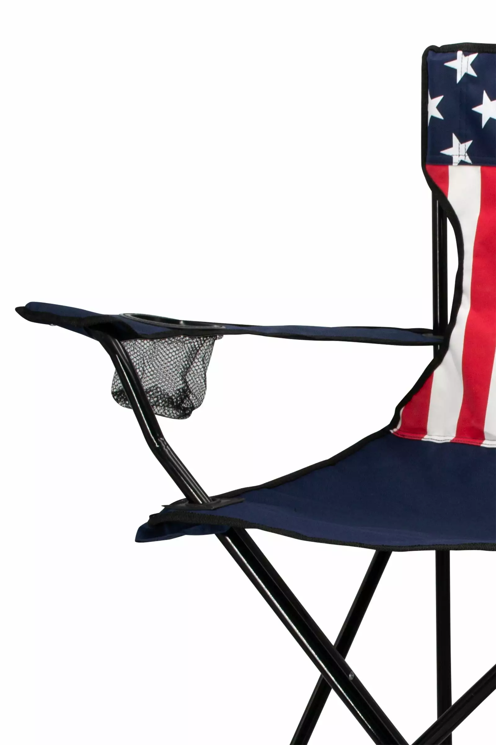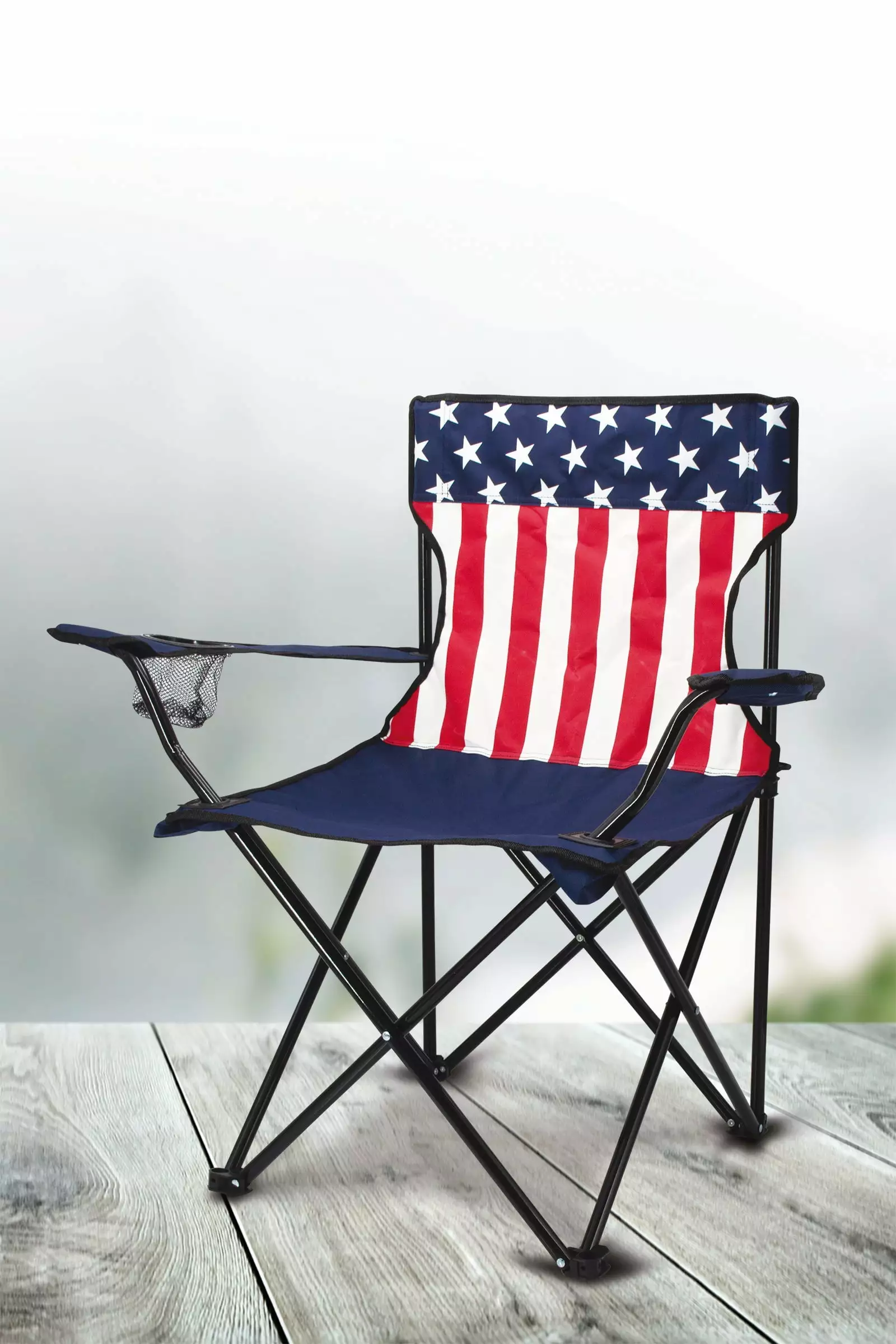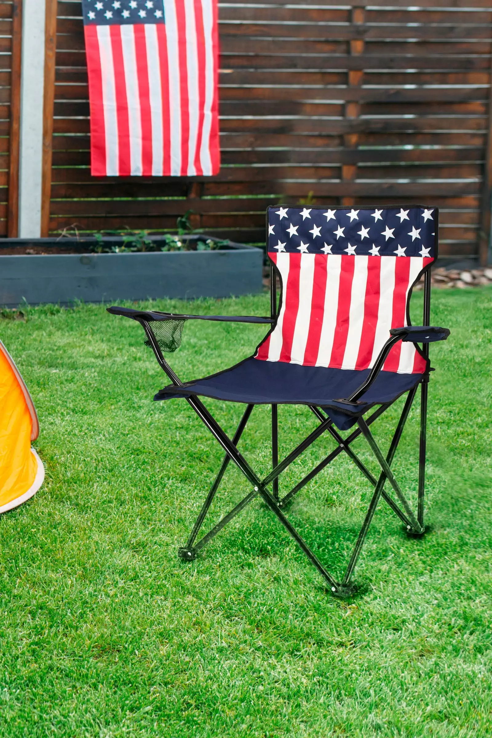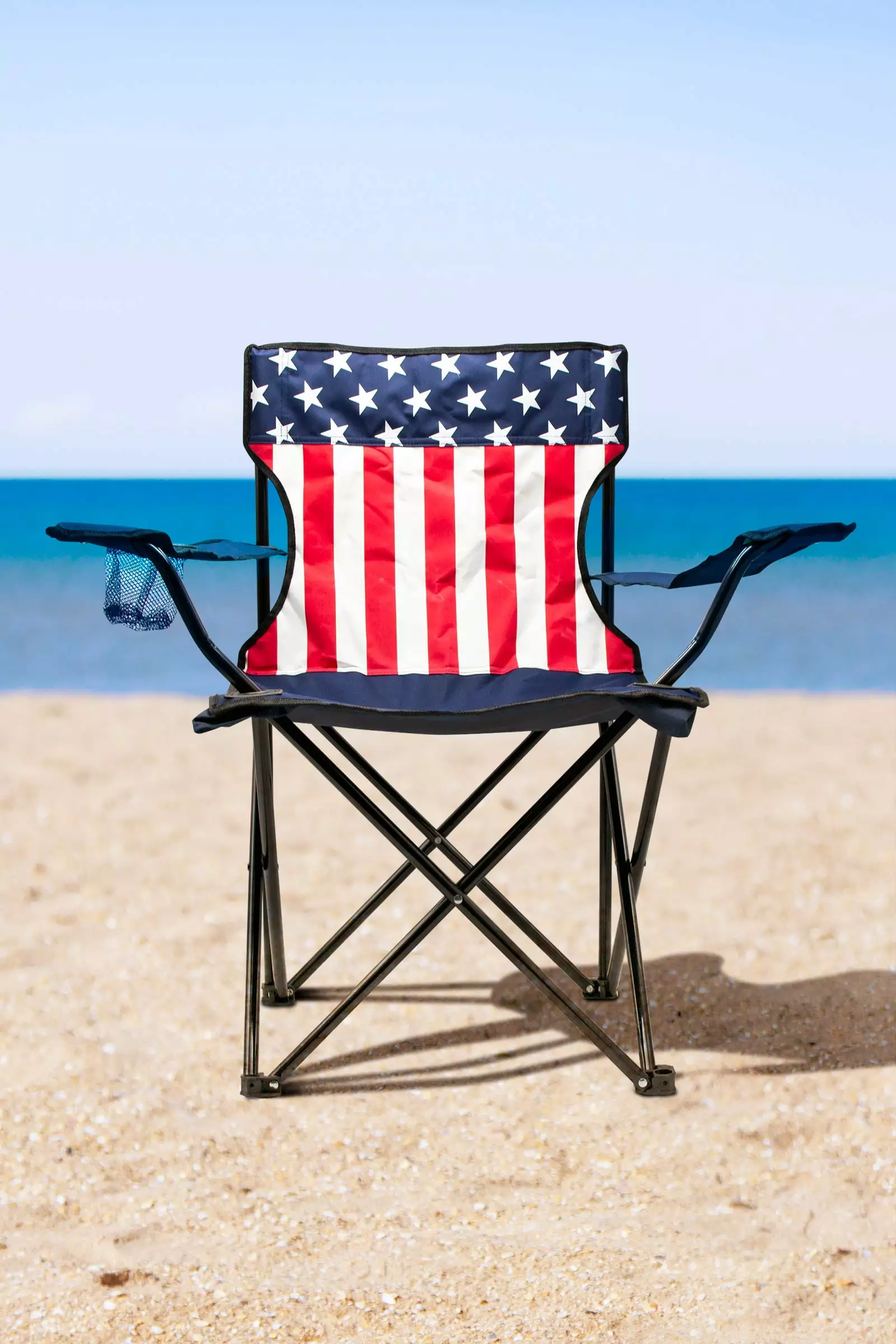 This patriotic camping chair is perfect for your Fourth of July celebrations! The durable steel frame and mesh cup holder are reliable and will last through multiple uses. while the patriotic flag print makes it a festive addition to any event. The steel frame holds up to 300lbs. The lightweight and portable design makes it easy to carry. and the multipurpose functionality means you can use it for more than just the beach – take it to picnics. tailgates. or any outdoor event. Best of all this beach chair comes with a carry bag. making it easier to carry around during sporting events or hikes.