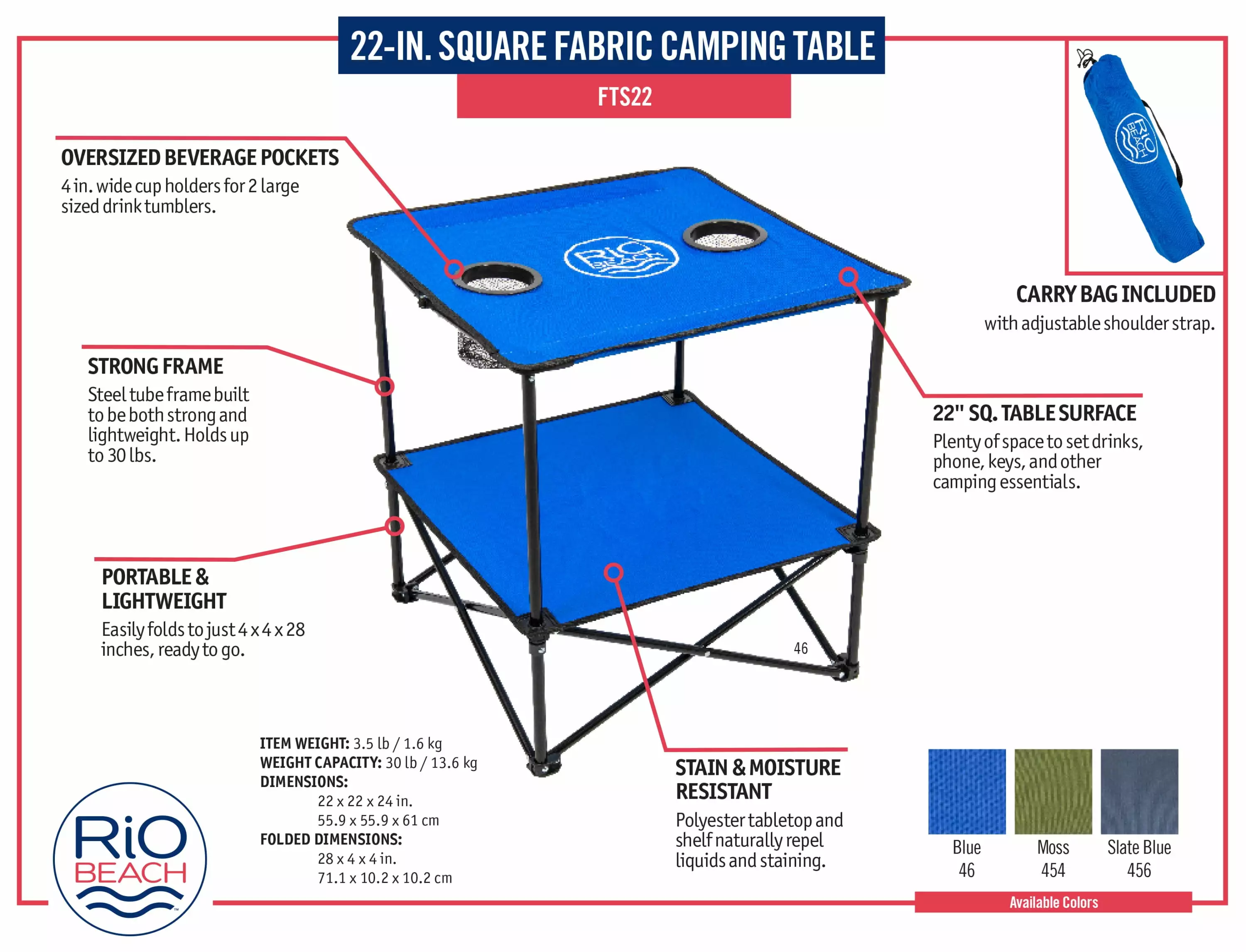 Enjoy Family Time In The Sand With A Portable Compact Folding Beach Table From Rio Beach. The Base Of The Portable Family Beach Table Folds Like A Quad Chair. And The Fabric-Covered Tabletop Snaps On And Off For Storage. The Tabletop Also Has A Tension Frame For Stability.