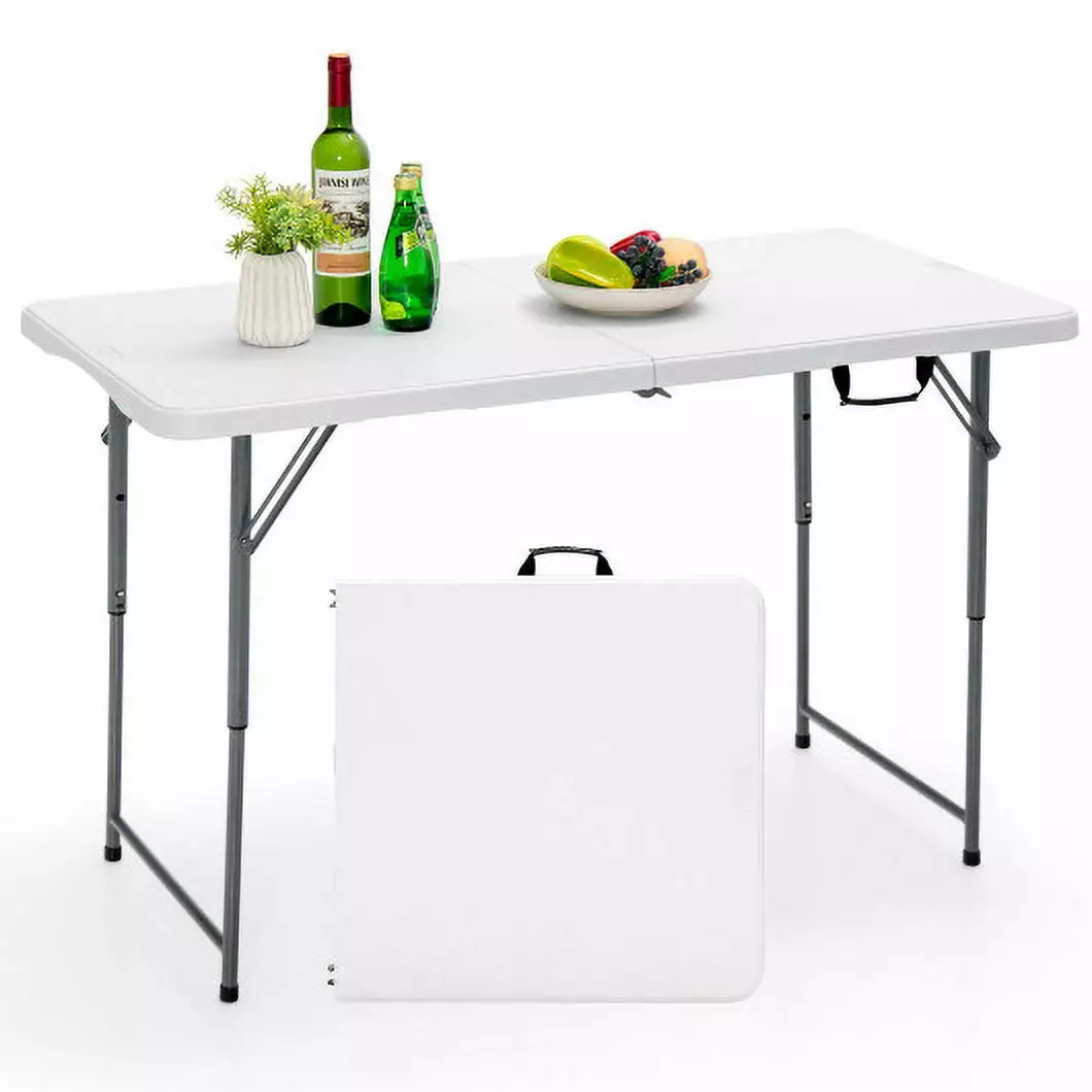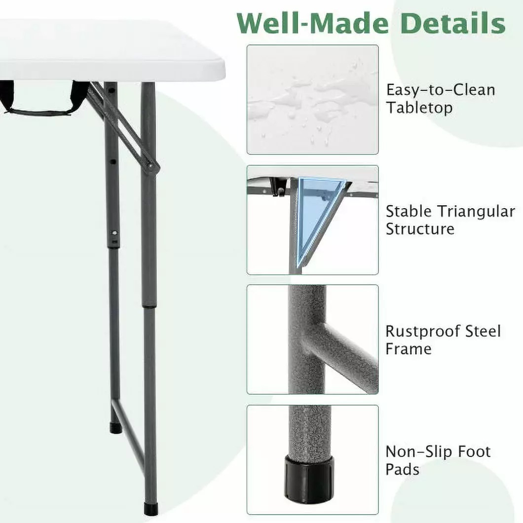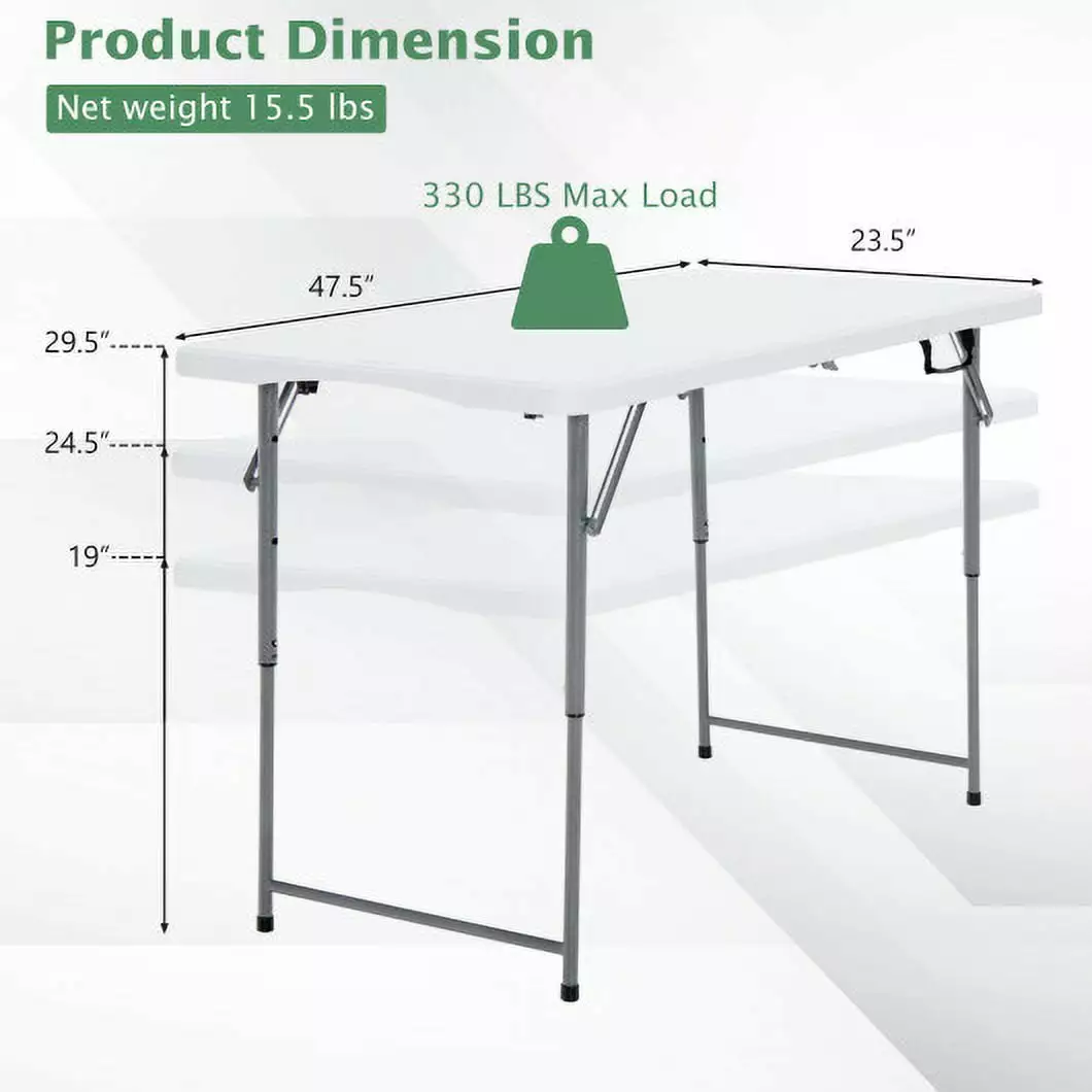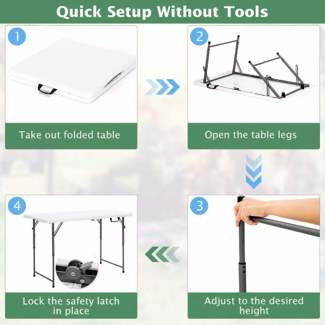 a??? Convenient to Use and Maintain: Coming with an illustrated instruction the folding table is easy to set up adjust height and fold up in seconds. It doesn’t require any difficult assembly process at all. In addition the stain-resistant and waterproof HDPE tabletop makes cleaning a breeze.