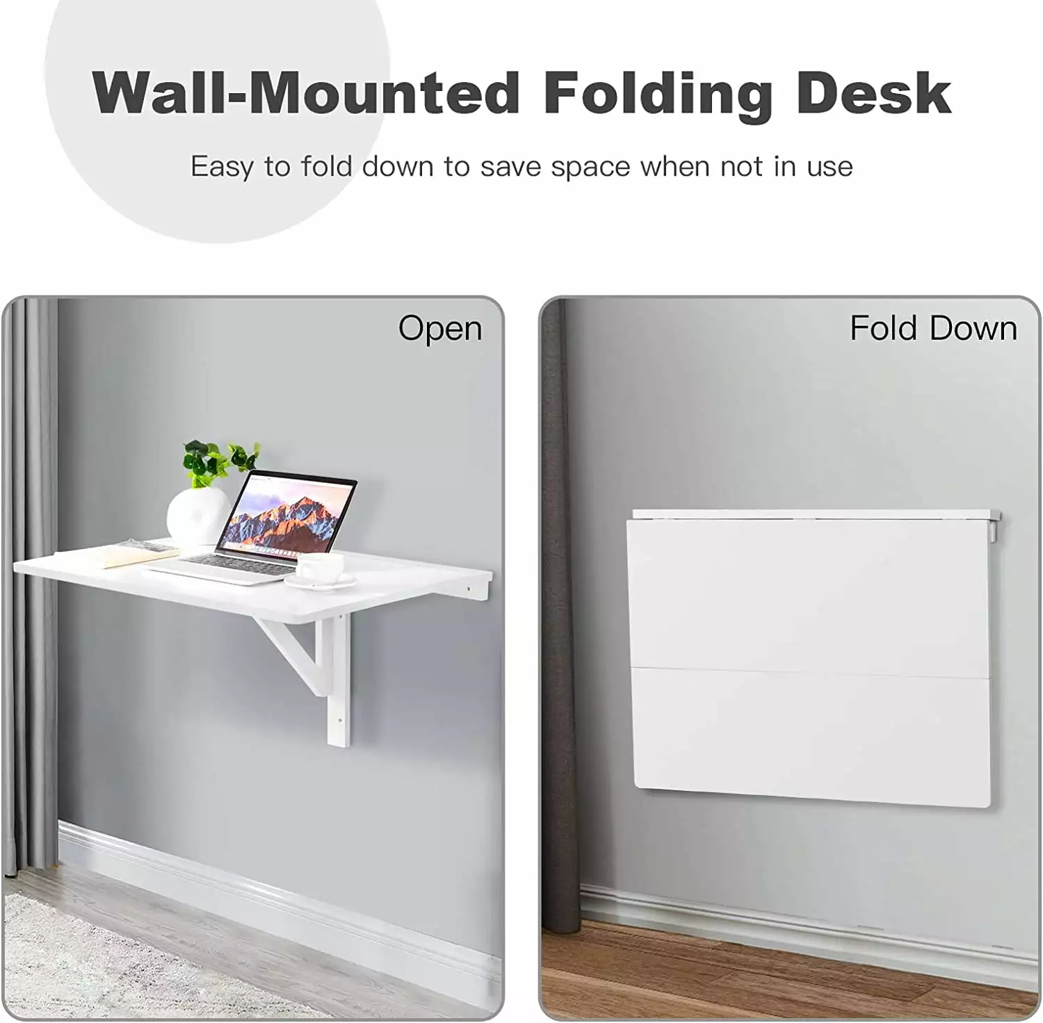 Premium Material Our wall mounted table was mainly made of high quality P2MDF. which is environmental-friendly. durable and can withstand great load. The paint is without harsh chemicals. and odorless. 2 Ways of Simple Folding Our drop-leaf wall mounted table is a great helper especially in a narrow room. just loose the hinges to lay down one board when you do not have many items to put on it. or fold down the two boards when not needed. Multi-functional for Use You may place your laptop on it or hold your favorite magazines in your study room. and using it as a dining table will also be fine. In your bathroom. it can also be your cosmetics holder. Solid Construction With a triangular wooden bracket. when mounted on the wall. the table will stand steadily. and the metal hinges and the screw also help fix it. Round edge design avoids accidental injury. Easy to Assemble and Clean You may refer to the detailed assembly instructions to finish the assembly work in only half an hour. And cleaning can be done with a clean damp cloth.