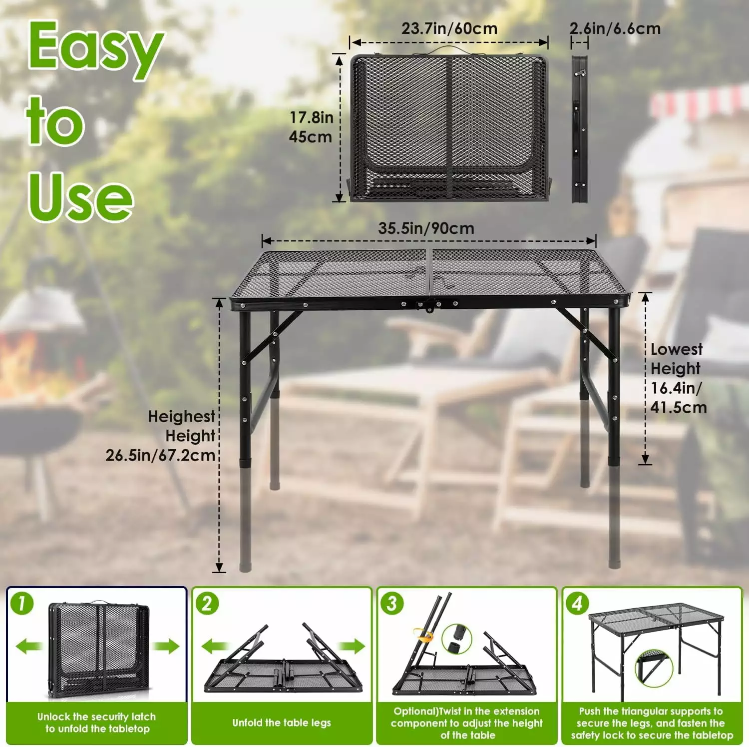 JEIGKEN 3??2 FT Barbecue Foldable Table for Outside Camping with Mesh Desktop. Height Adjustable Grill Folding Table. Lightweight Aluminum Portable Metal BBQ Table Multi-Purpose
