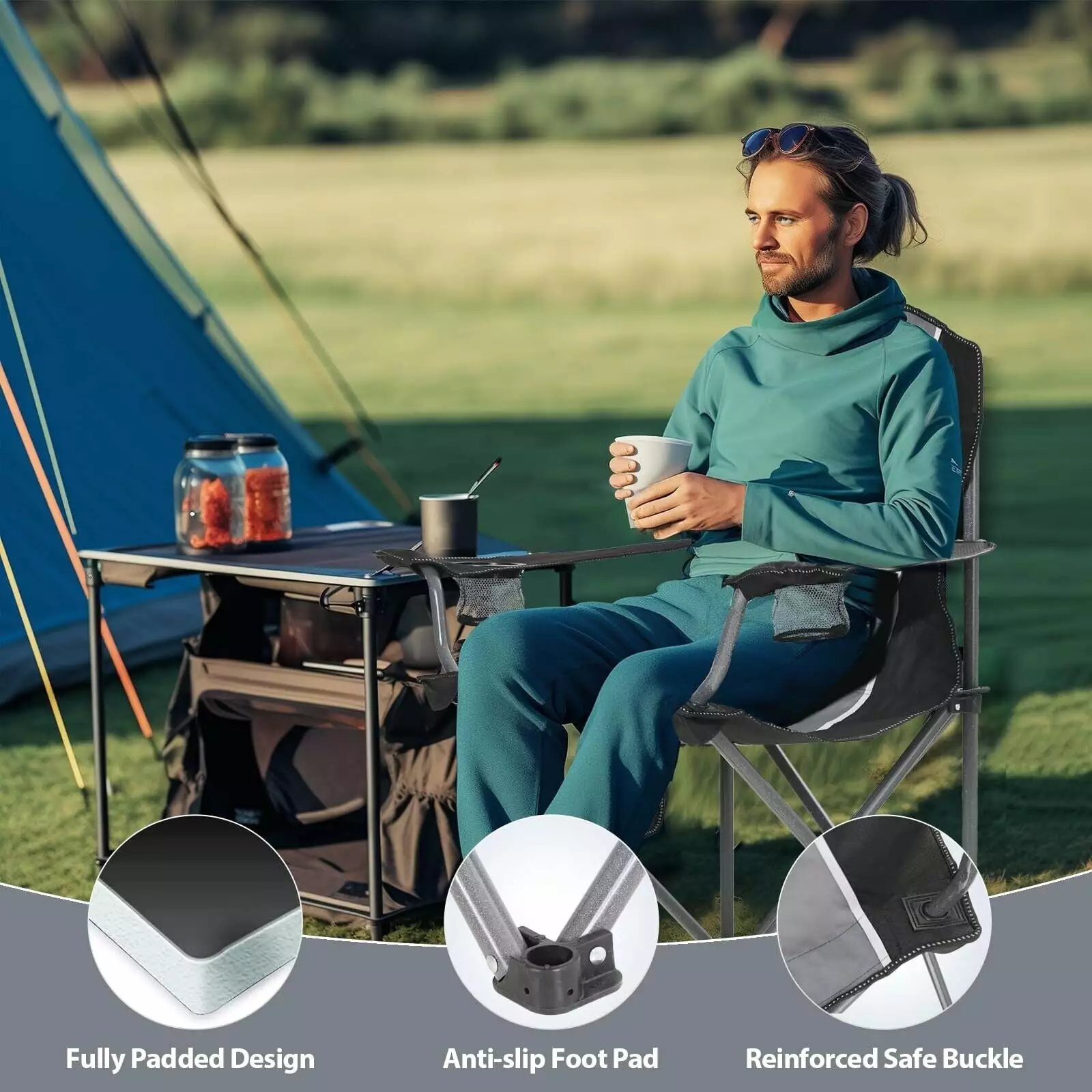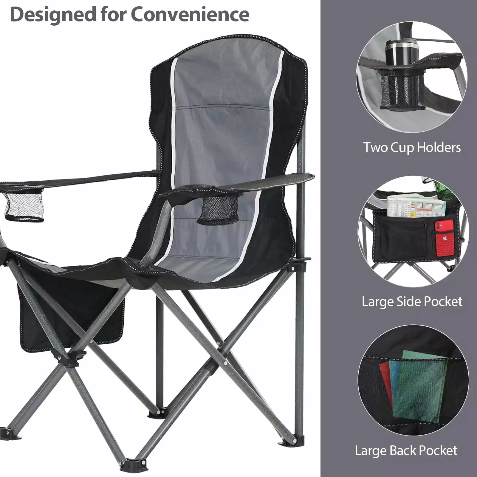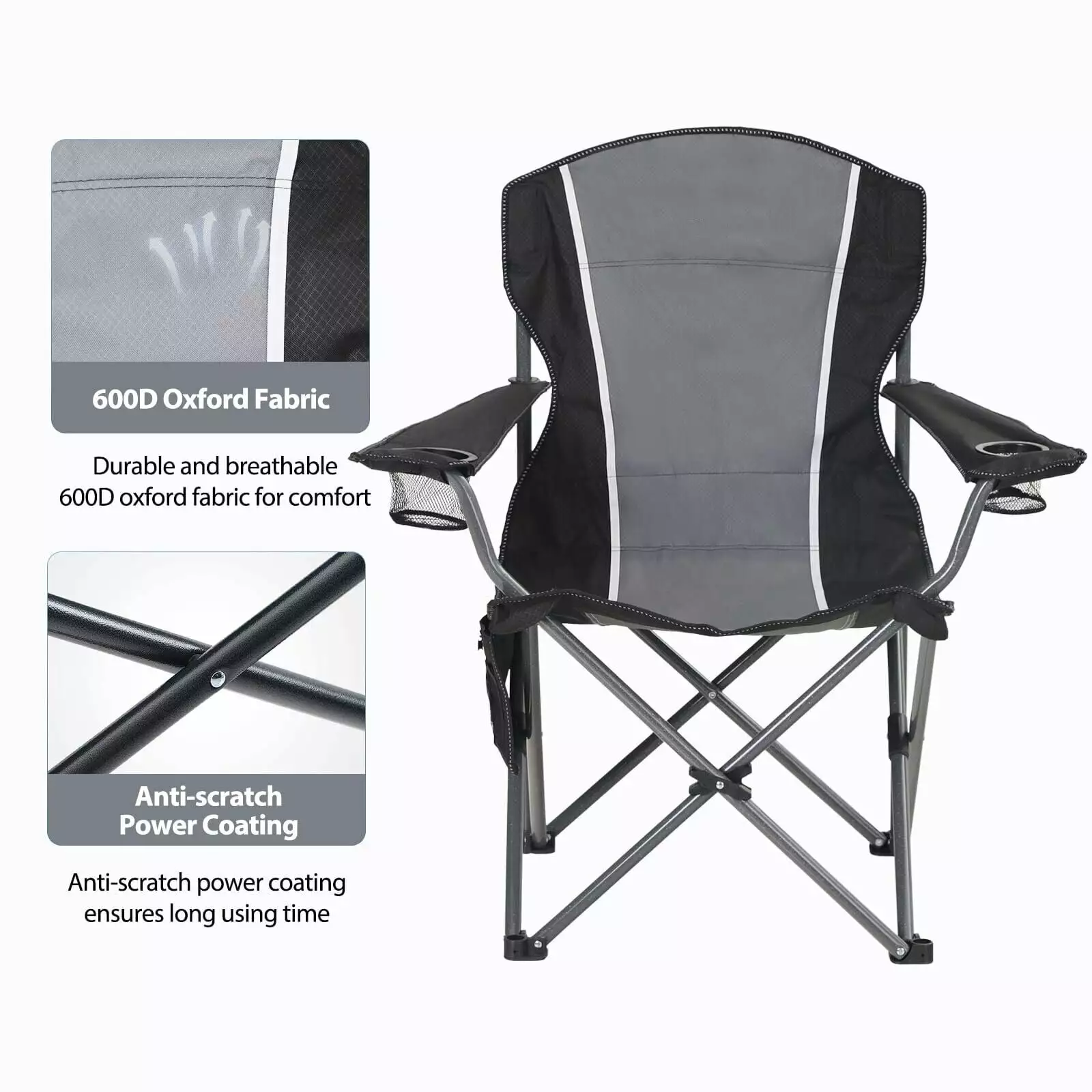 Unique X-shaped parts The unique X-shaped parts make more thorough contact with the steel tube. allowing the camping chair to withstand more force and gain stable support. Thicker 600D oxford cloth Folding camping chairs are durable. tear-resistant. breathable. waterproof. and easy to clean. Perfect for long outdoor adventures.350 LBS Folding Camping Chair Heavy Duty Outdoor Chair Oversized Cup Holder