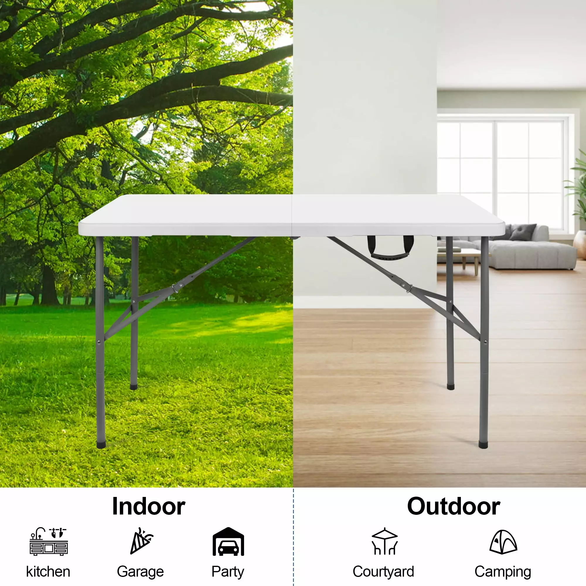 4 ft Portable Folding Table. Idustrial Heavy-Duty Foldable Table. HDPE Plastic Table. with Carrying Handle. Locks. Stright Legs for Indoor & Outdoor Party. Barbeque. Camping. Board Games – White