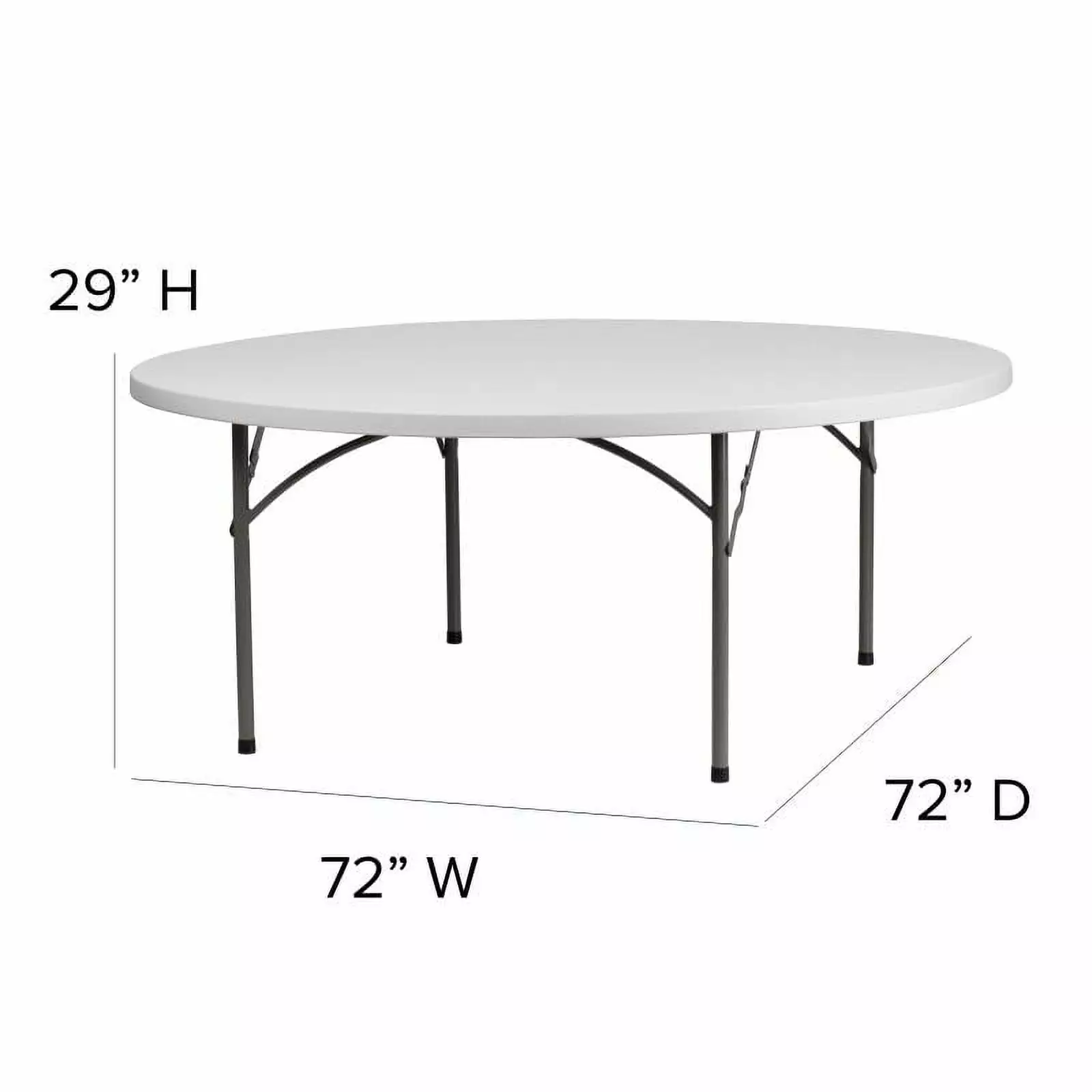 Set of 5 Tables. This round dining folding table is a great option for special event planners. catering companies and banquet facilities. This durable. easy to clean table is commercial rated for use in banquet halls. convention centers and at trade shows. Use during game night. dress it up for holiday parties. and coordinate crafts night. The thick. granite white tabletop is 6′ in diameter. 1 3/4" thick. and will comfortably seat up to 10 adults. Its waterproof. impact and stain resistant top has a 600 pound static load capacity. Attractive gray powder coated legs lock securely in place while in use and fold up neatly underneath to transport and store. Non-marring floor caps protect your floor by sliding smoothly when you need to move it. Designed for both indoor and outdoor use. the 72" Round Granite White Plastic Folding Table is a convenient option for your next home. school or business event. Designed for both indoor and outdoor use. store table indoors and protect the frame from extreme moisture. Ready To Use Commercial Table 6′ Folding Table Seats up to 8-10 Adults 200 lb. Static Load Capacity 1 3/4" Thick Granite White Table Top Waterproof. Impact and Stain Resistant Top Gray Powder Coated Locking Legs Protective Floor Caps Designed for Indoor and Outdoor Use Single Unit Weight: 75.62 lbs Fixed Width: 72 Inches Fixed Depth: 72 Inches Fixed Height: 29 Inches Weight Capacity: 600 lbs Ready To Use Commercial Table 6′ Folding Table Seats up to 8-10 Adults 600 lb. Static Load Capacity 1 3/4" Thick Granite White Table Top Waterproof. Impact and Stain Resistant Top Gray Powder Coated Locking Legs Protective Floor Caps Designed for Indoor and Outdoor Use Single Unit Weight: 75.62 lbs Fixed Width: 72 Inches Fixed Depth: 72 Inches Fixed Height: 29 Inches Weight Capacity: 600 lbs