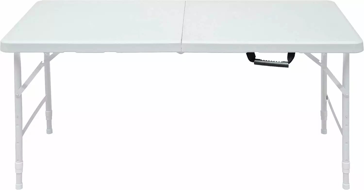 This durable. easy to clean table folds in half. making it easy to store and transport. using the convenient carrying handle attached on the side.