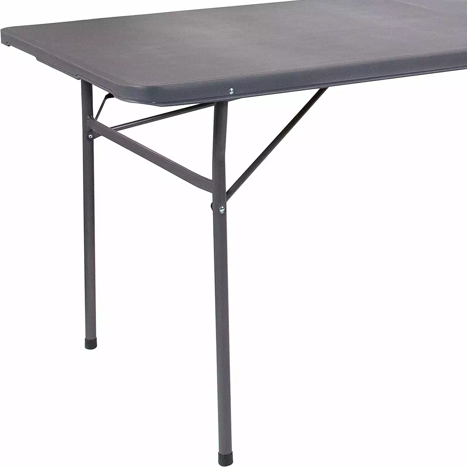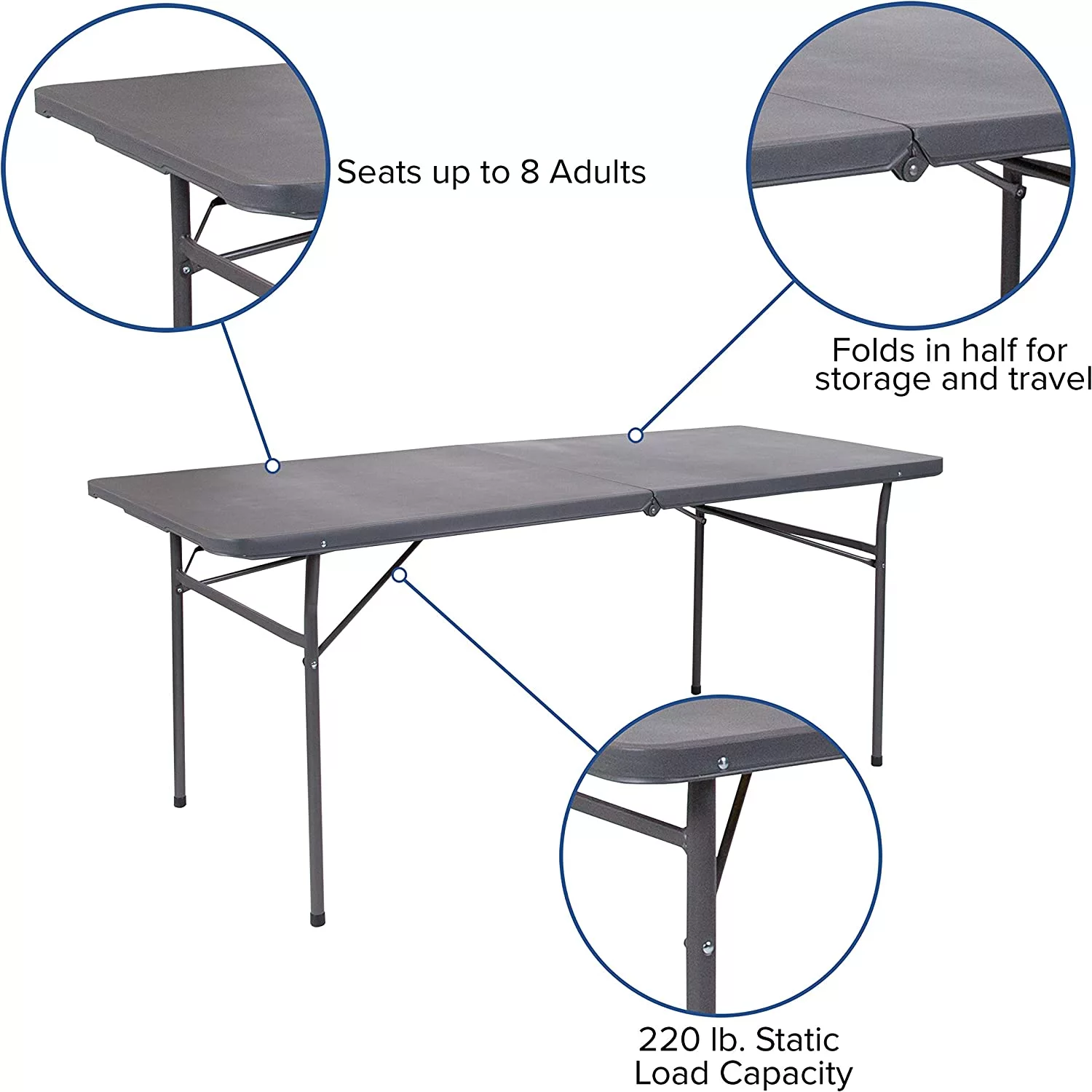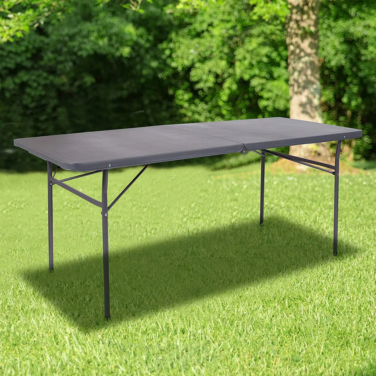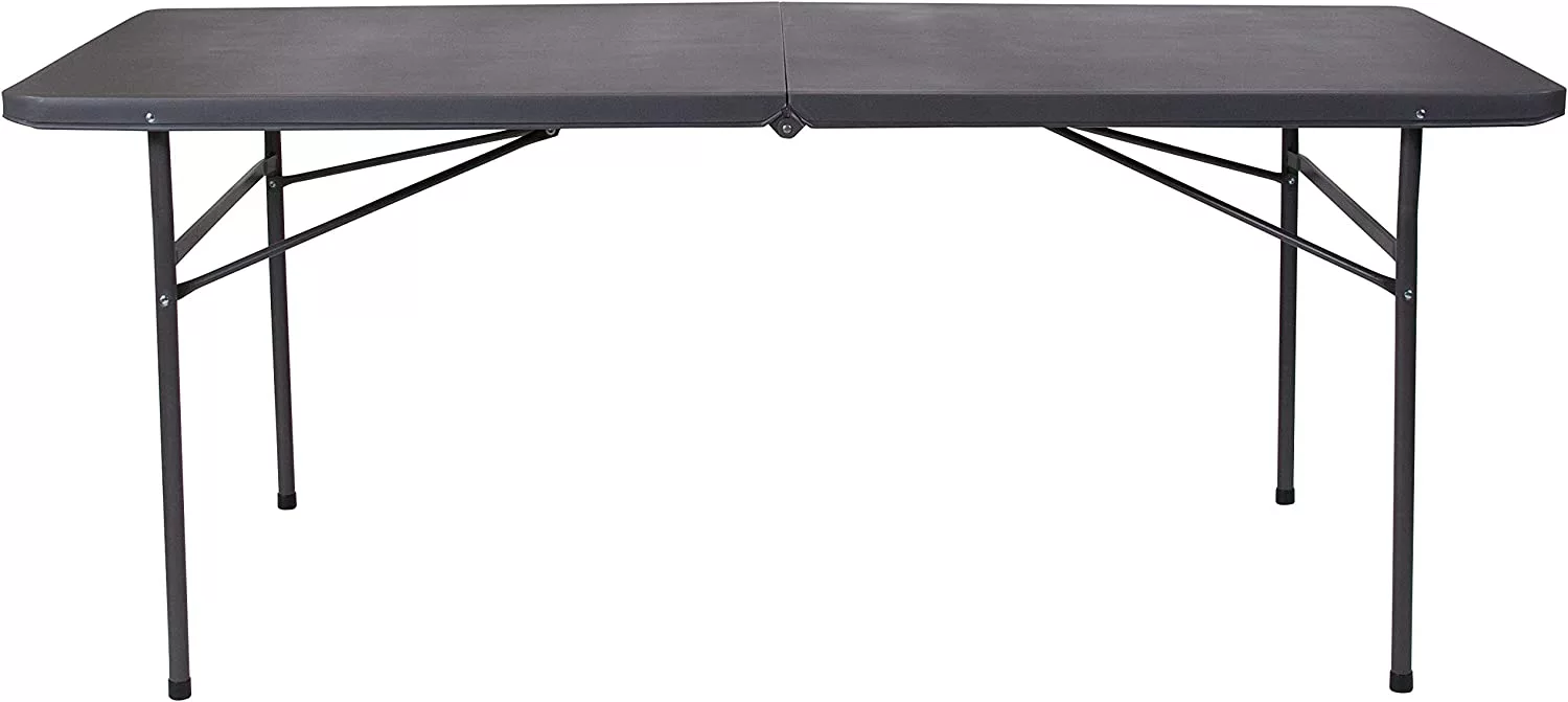 6′ Rectangular Plastic Folding Event Table with Carrying Handle. Bi-Fold Portable Banquet Table for Indoor/Outdoor Events. Dark Gray