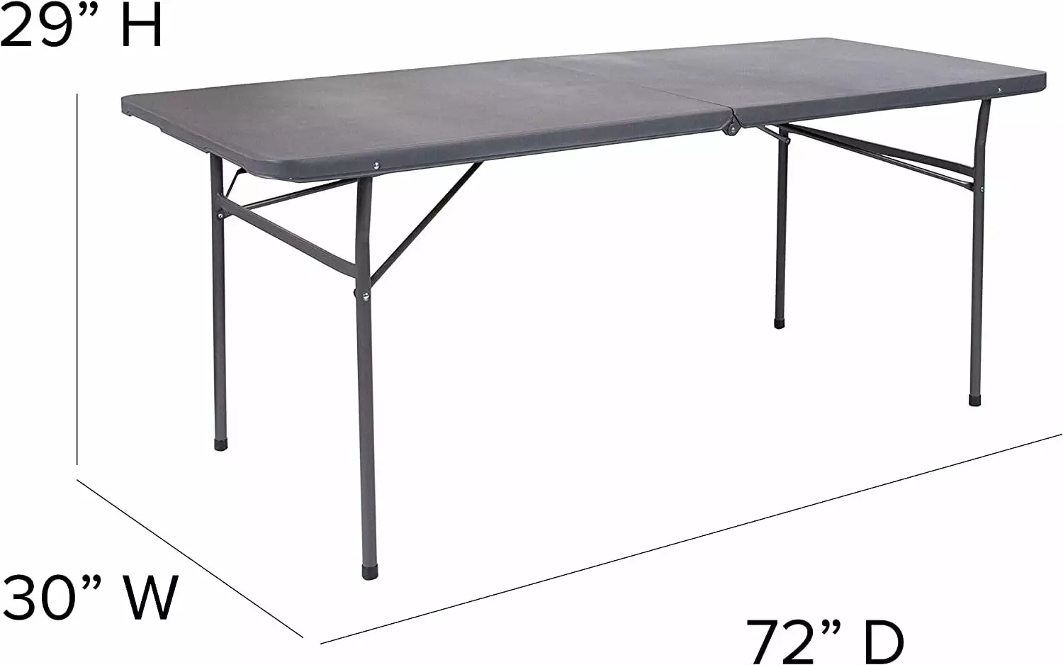 Always be ready for your next event or get-together with the 6′ Bi-Fold Plastic Folding Table. Whether you’re hosting an indoor or outdoor home. school. or business event. this plastic table offers a reliable. on-demand solution for when you need a little extra surface space for your guests. It comfortably seats up to 8 people. making it great for a variety of settings such as parties. conferences. family barbecues. trade shows. corporate events. reception areas. training rooms. banquet venues. and much more. The convenient bi-fold design and attached carrying handle on the side allows for easy transportation and compact storage after use. and the non-marring floor caps on the bottom of the locking legs protect your flooring surfaces. Constructed with a 1.5 thick waterproof and impact and stain-resistant tabletop and durable gray powder-coated locking legs. this folding event table withstands years of quality use at indoor and outdoor events. and it can be used as is or dressed up with a tablecloth to achieve a custom look. This banquet table can support up to 220 pounds of static weight and measures 30W x 72D x 29H with no assembly required. so you can start setting up for events right away. As needed. the low-maintenance rectangular folding table can be cleaned with solvent and a water-based cleaner such as foam.