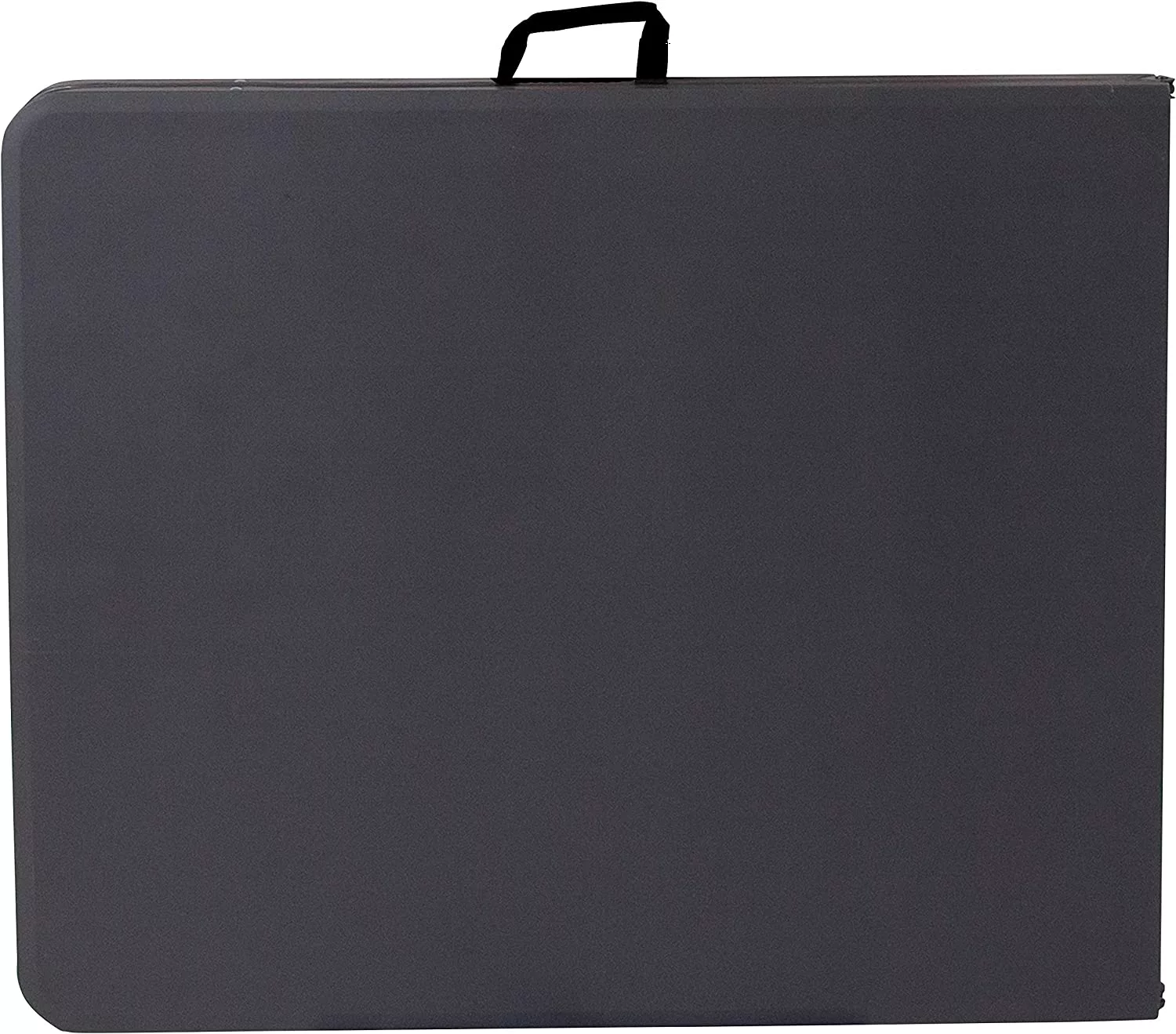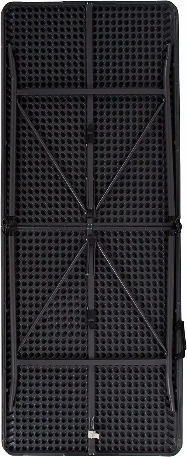 This durable. easy to clean table folds in half. making it easy to store and transport. using the convenient carrying handle attached on the side.