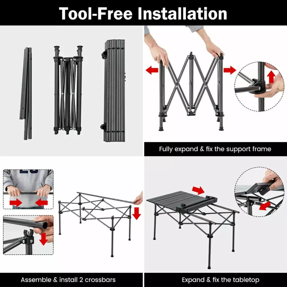 - Tool-Free Installation: The package contains a detailed manual to guide you to unfold the frame and fix the 38 x 22 (L x W) tabletop with preinstalled buckles. By the way. the whole setup needs no tools. which is very thoughtful for outdoor use.