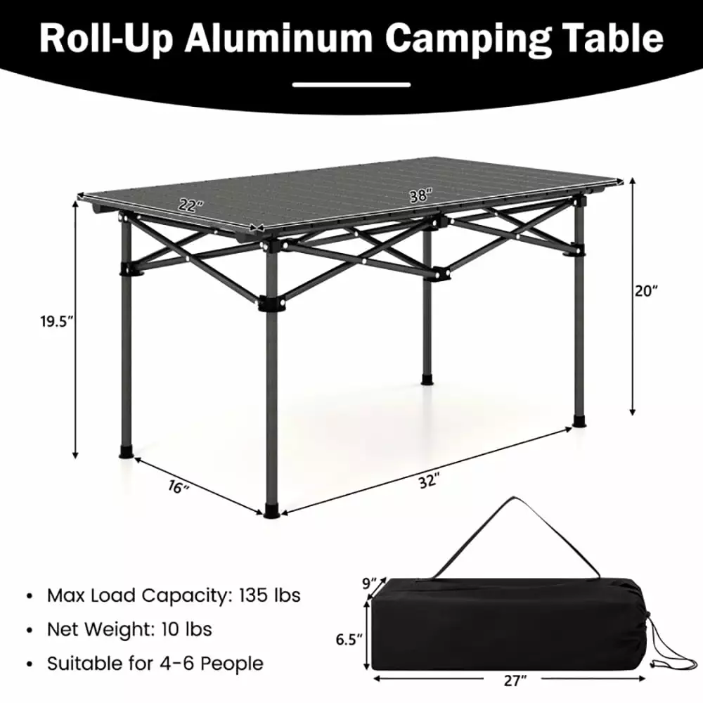 - Strong Aluminum Tabletop: 16 aluminum slats form a rigid tabletop to resist a harsh outdoor environment. More. the 38 x 22 x 20 (L x W x H) camping table is ideally rustproof. heat-proof and lightweight for convenient long-term use. while waterproof for easy maintenance.