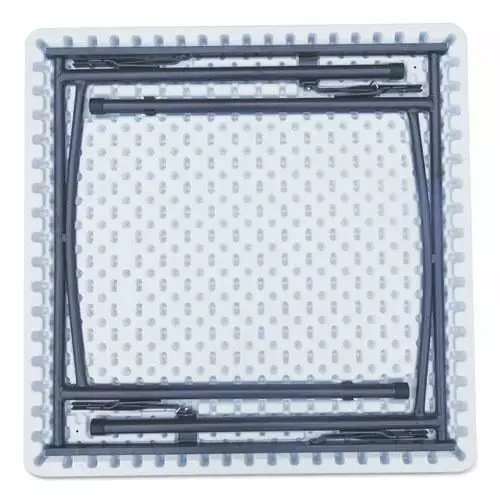 Versatile folding table is perfect for indoors or outdoors. Convenient square. folding table sets up quickly when you need an extra table and space is limited. Blow-molded polyethylene top is water and stain resistant to ensure it won’t crack or stain. Strong. durable. powder-coated metal construction withstands dents and scratches. Slide lock feature enhances table stability once opened. Legs fold flush into table creating a flat surface for easy storage and stacking. Non-marring foot caps prevent floor damage. Supports up to 600 lbs. of evenly distributed weight.