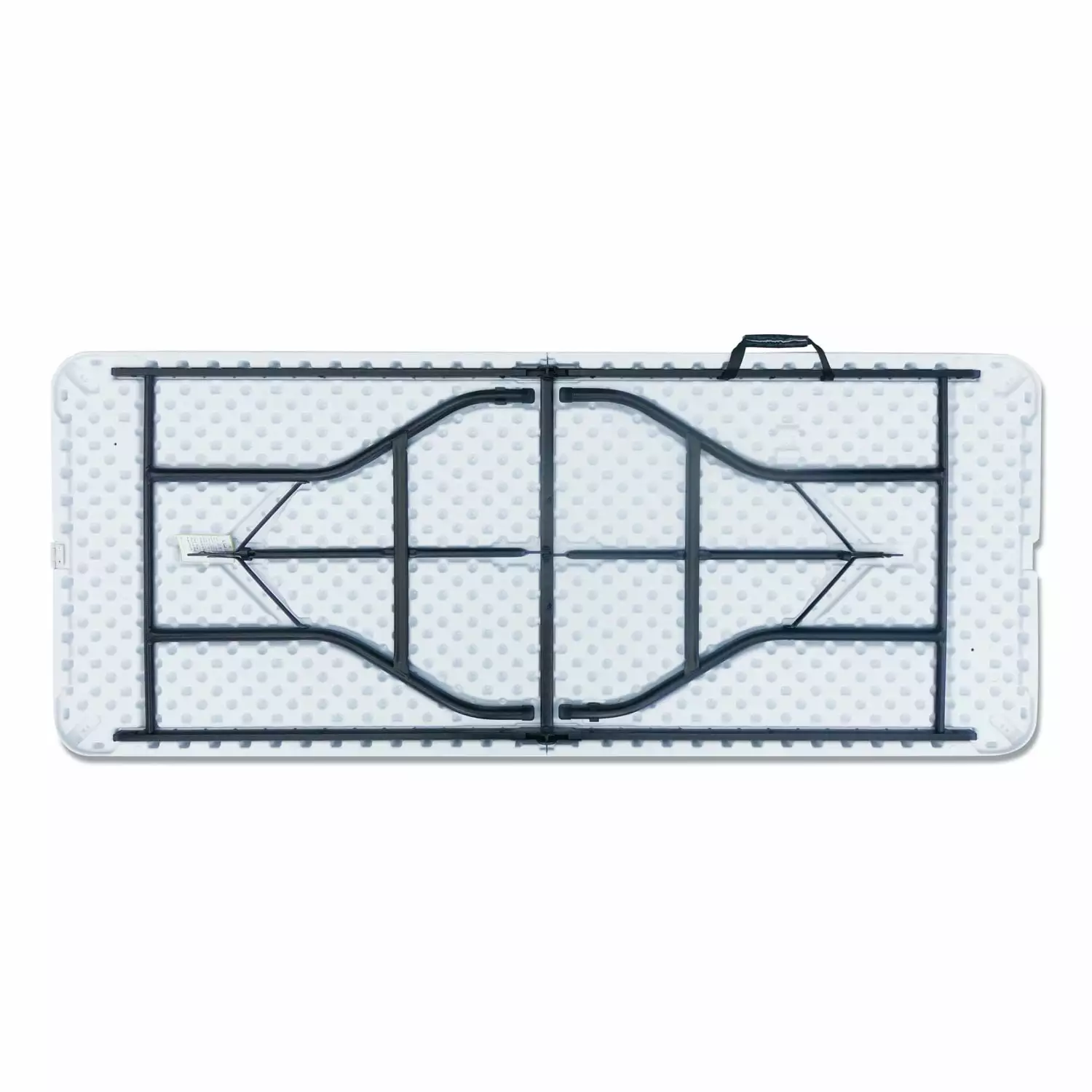 This Alera lightweight resin folding table is great for both indoor and outdoor use. Conveniently folds in half for compact storage. Table features a fold-away carrying handle and dual casters for convenient transport. Strong powder coated steel frame resists corrosion and provides exceptional stability. Durable resin table top is dent-. scratch- and stain-resistant and washes clean easily. Set-up is simple with gravity-leg locking mechanism. Steel tube legs with non-marring rubber foot caps. Top Color: White; Color Family: White; Base Color: Black Anthracite; Top Shape: Rectangle.