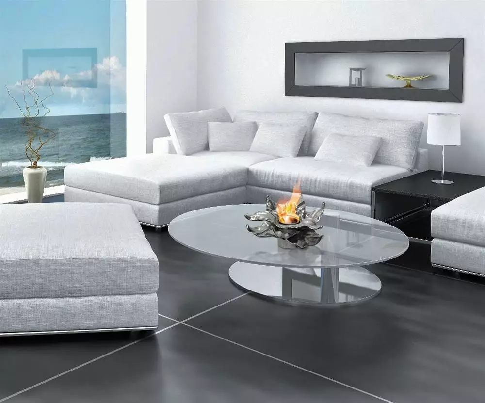 - This elegant . Anywhere fireplace Heathcote gel fuel table top model fireplace brings the ambiance of real fire to your space. indoors or out. The Heathcote is part of the a beautiful botanical series that makes your table bloom with its sophisticated design and silver or gold patina. Place it on any steady surface a dining table. coffee table. countertop anywhere you wish to enjoy the dancing flames of a real fire.