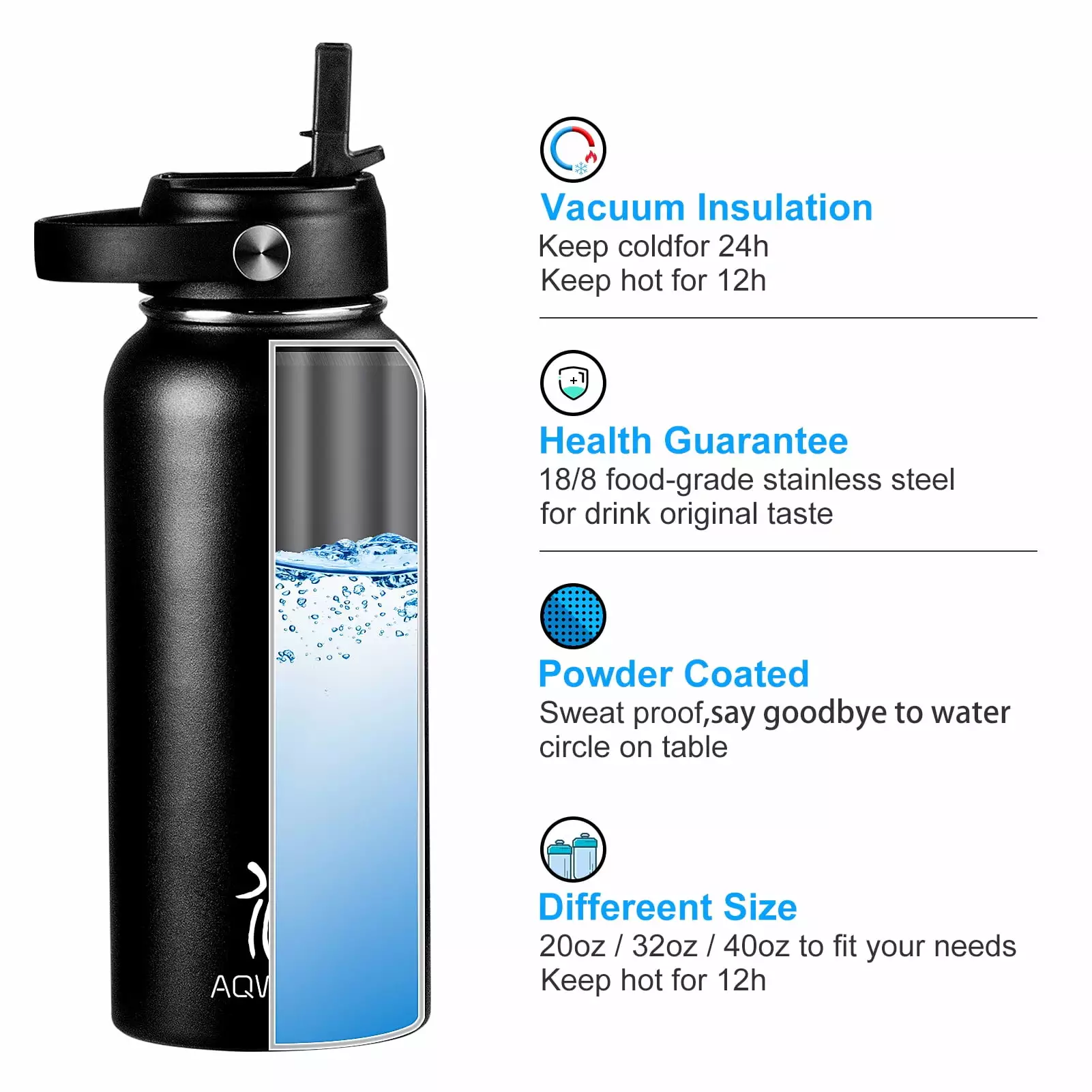AQwzh 20 oz Black Vacuum Insulated Stainless Steel Water Bottle with Wide Mouth and Straw Lid