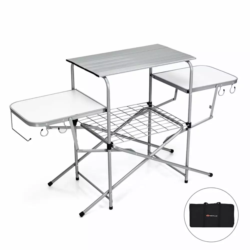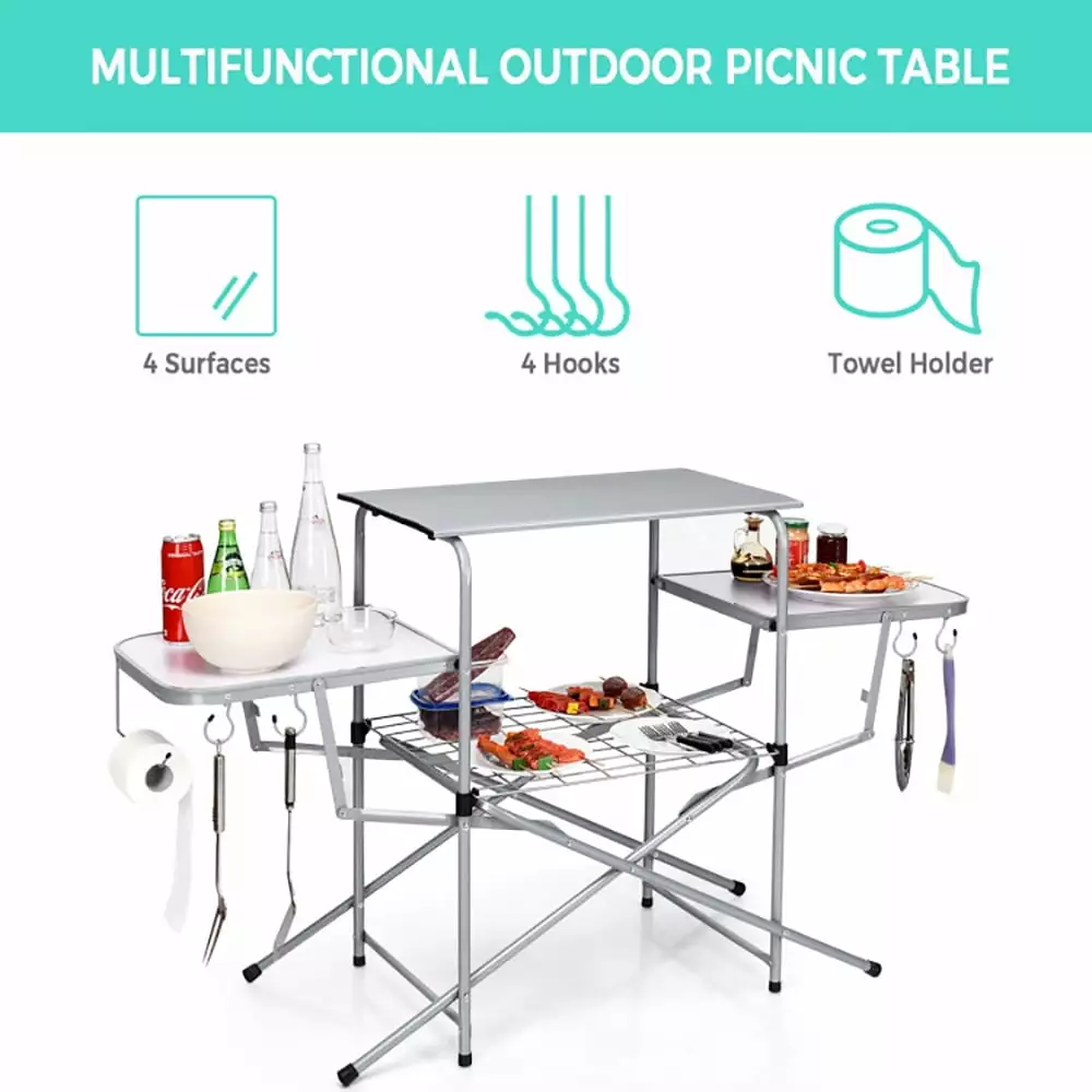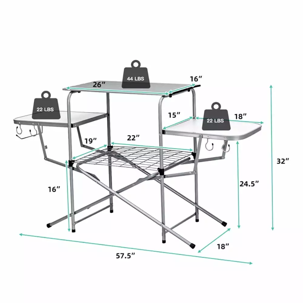 -Perfect for BBQ party camping picnics backyards and tailgating-Multifunction shelves with built-in four hooks and paper towel holder to easy-use-Setting up and breaking down in a flash with its hassle-free one-piece design-Sturdy powder-coated steel frame construction serves you a long time-Large tabletop 2 side shelves and lower shelf offer enough space for all of your cooking gear-Heat-resistant aluminum countertop perfect for a portable stove or tabletop grill-Folds flat for easy storage and won’t take up a lot of space-Lightweight only 17 lbs and portable for easy to take-Rubber feet make table more stable -Including a portable carrying bag