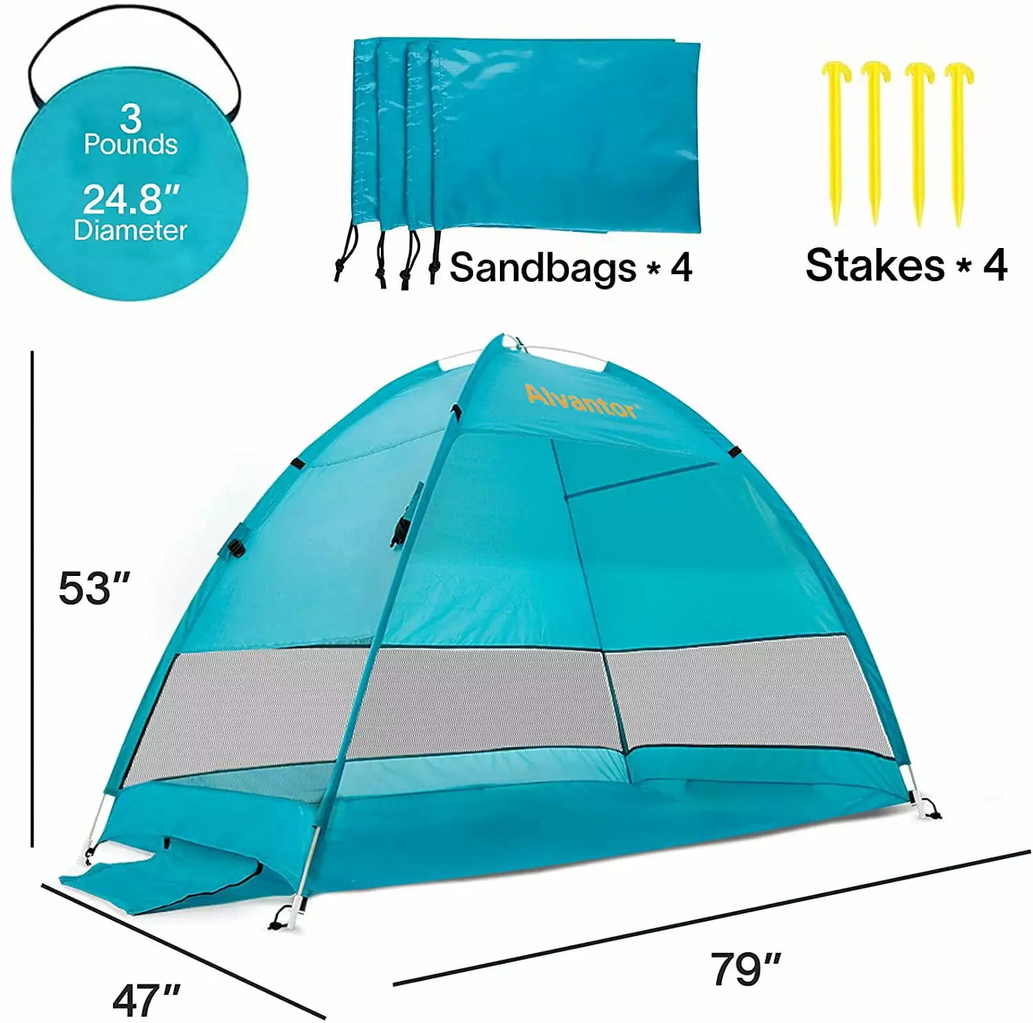 DOME DESIGN: This vibrant teal color tent comes with 3 mesh windows that would be great for air flow. We have extended our floor for extra space and stretching. Our tent is very sturdy because it is supported by high density pvc poles. We also included tent stakes for maximum stability. For extra support and stability we have included 7 fillable sand bags to weigh down the tent. It also provides 50+ UPF sun protection.