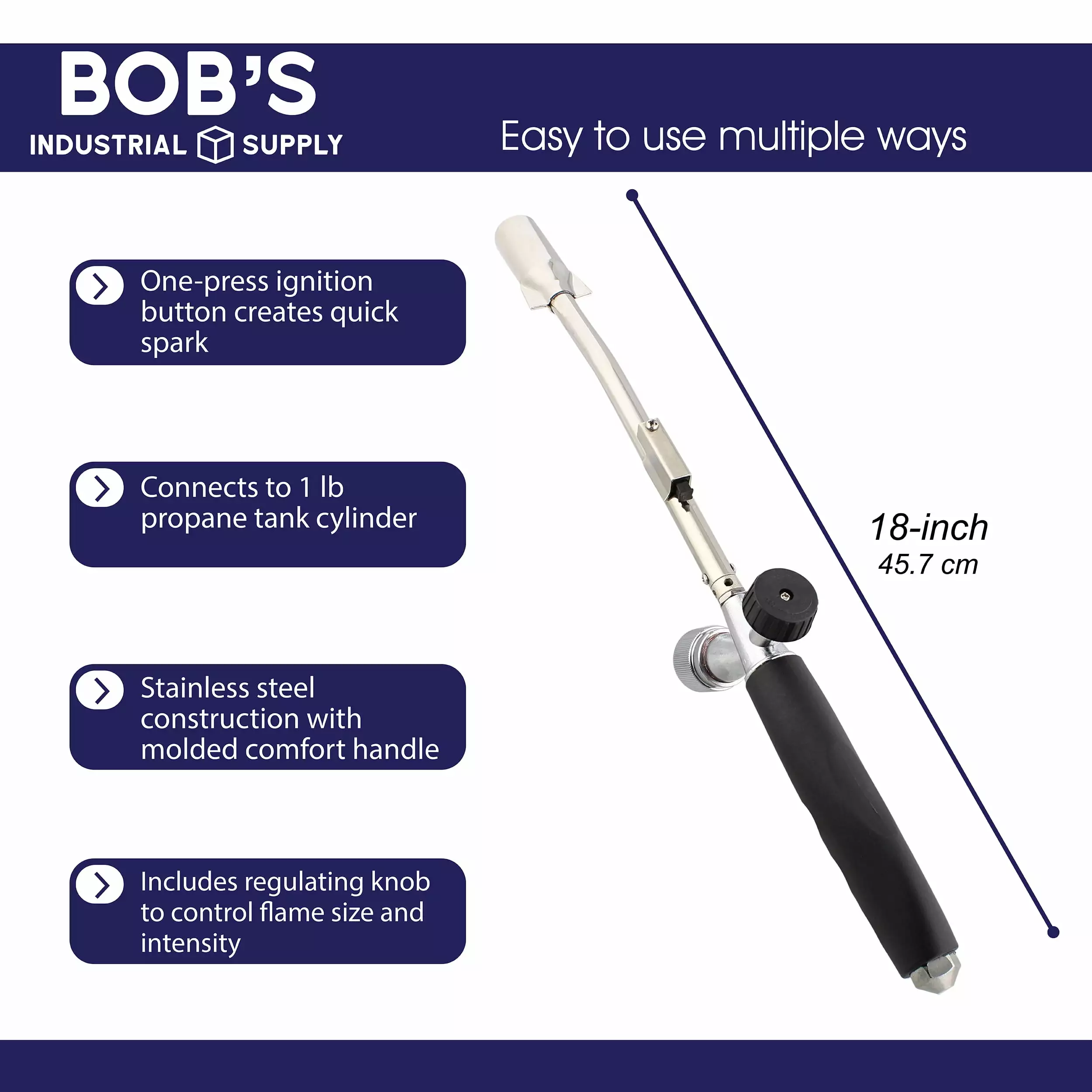 - [Optimal Control and Durability]: The full 18-inch (45.7cm) length (5.5in /14cm handle. 3in/7.6cm burner head. and 8in/20.3cm extension tube) ensures a safe reach; Electric torch is made of stainless steel for strength and features a molded ergonomic handle for comfort and control