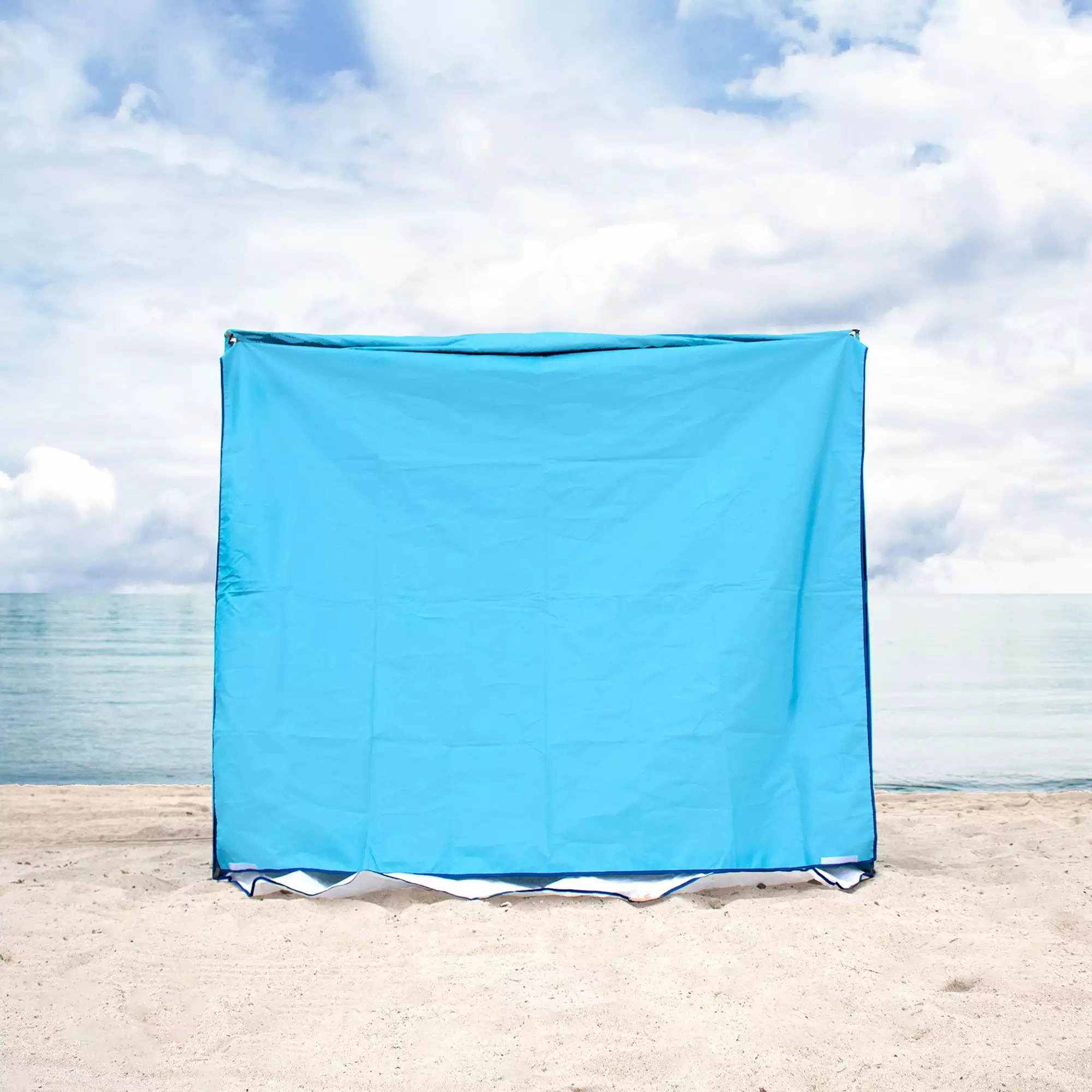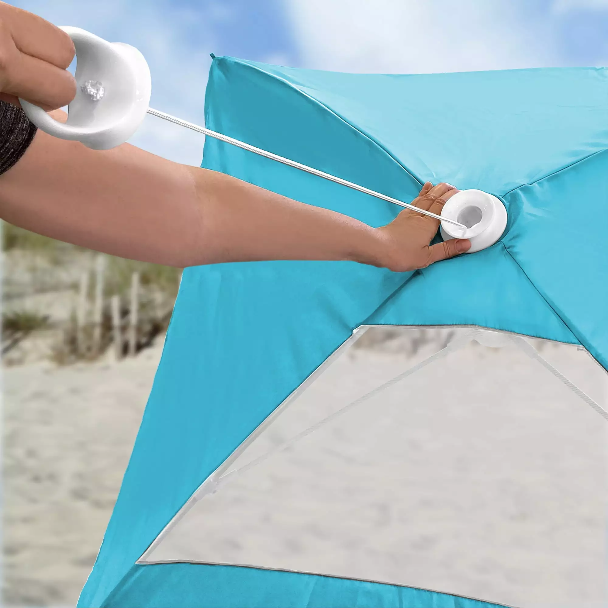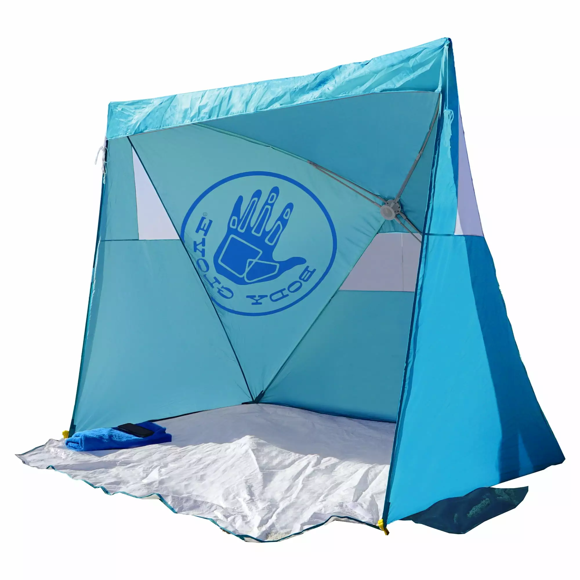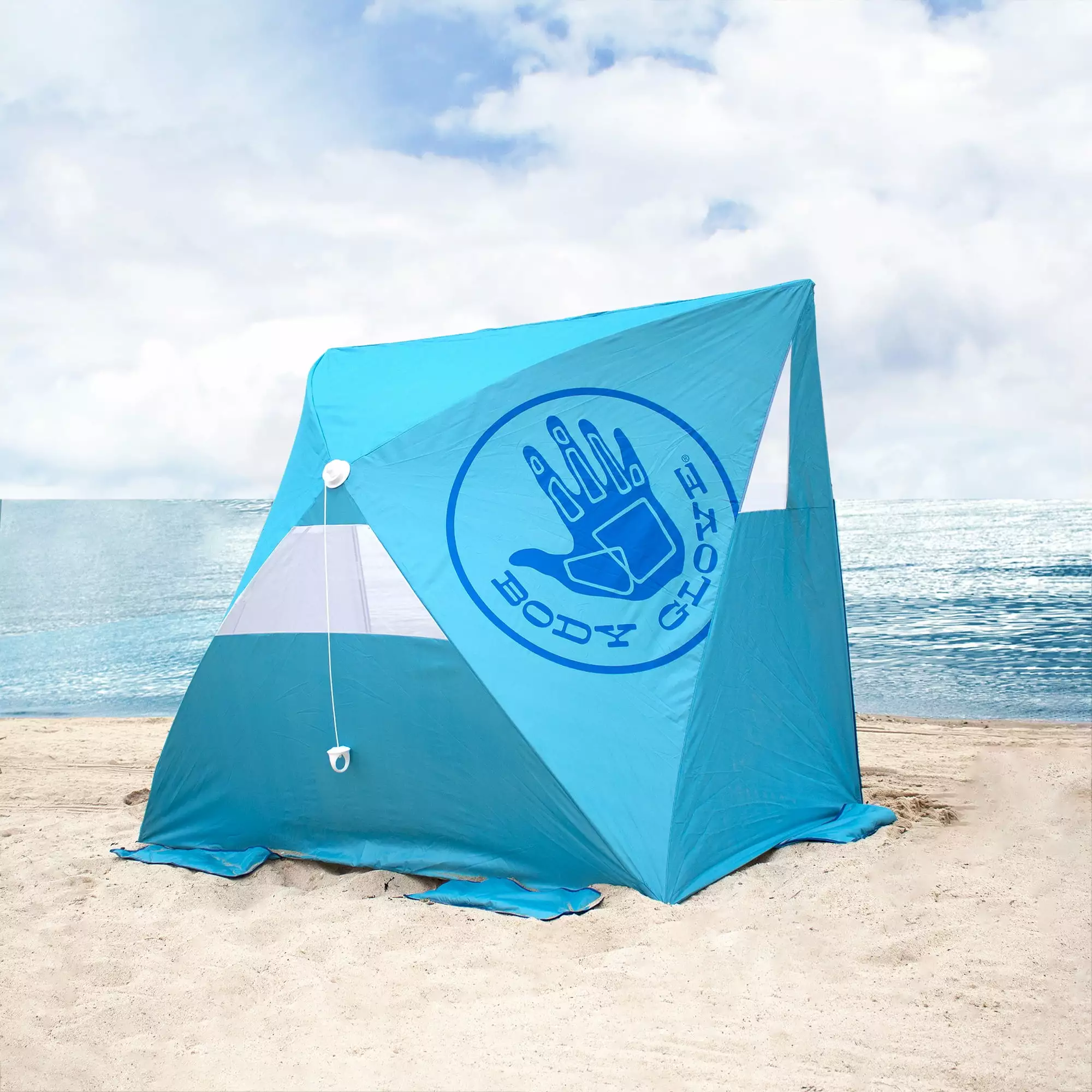 Enjoy ultimate privacy on the beach. lawn. patio. or while camping with the easy to assemble 2-person blue Body Glove pop-up square shelter. This 2-person shelter uses pull-cord technology to allow for super-easy set up and break down on the go and can provide shade. shelter. and privacy anywhere. Simply remove the shelter from the case and pull the cord to have it setup in seconds. It is roomy. has a ground covering attached to keep you clean and dry. and even features an optional pull-down privacy screen for changing clothes. extra shade. or just some time alone. This pop-up shelter also has roll-up window flaps for airflow or protection. The shelter includes sandbags. stakes. and sturdy poles for secure assembly. and it folds into a very compact and light carry case. This is the perfect setup for a day at the beach. park or even for some extra relaxation in the yard. The interior is large enough to fit two beach chairs comfortably. or simply lay on a towel or the attached ground covering for the ultimate experience.
