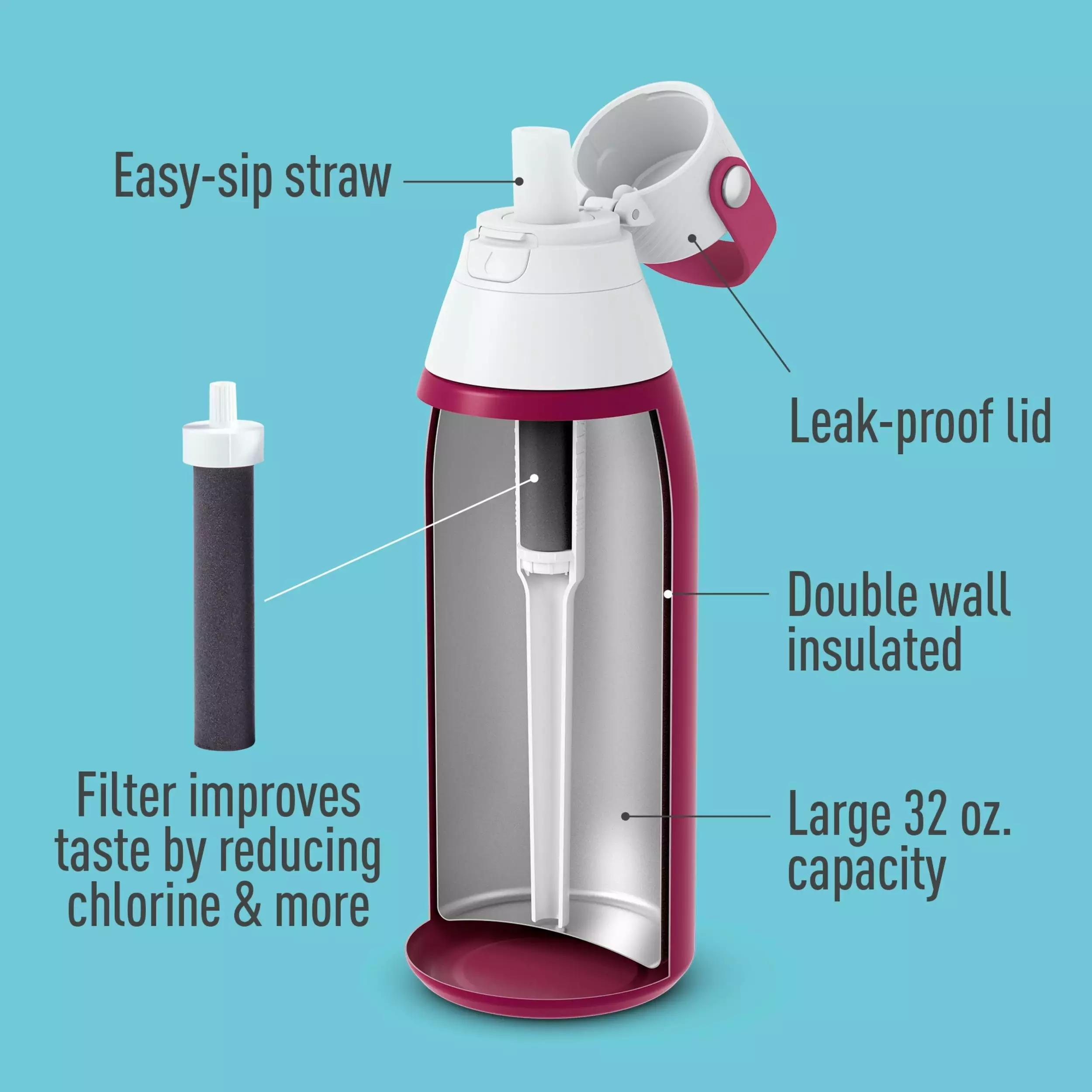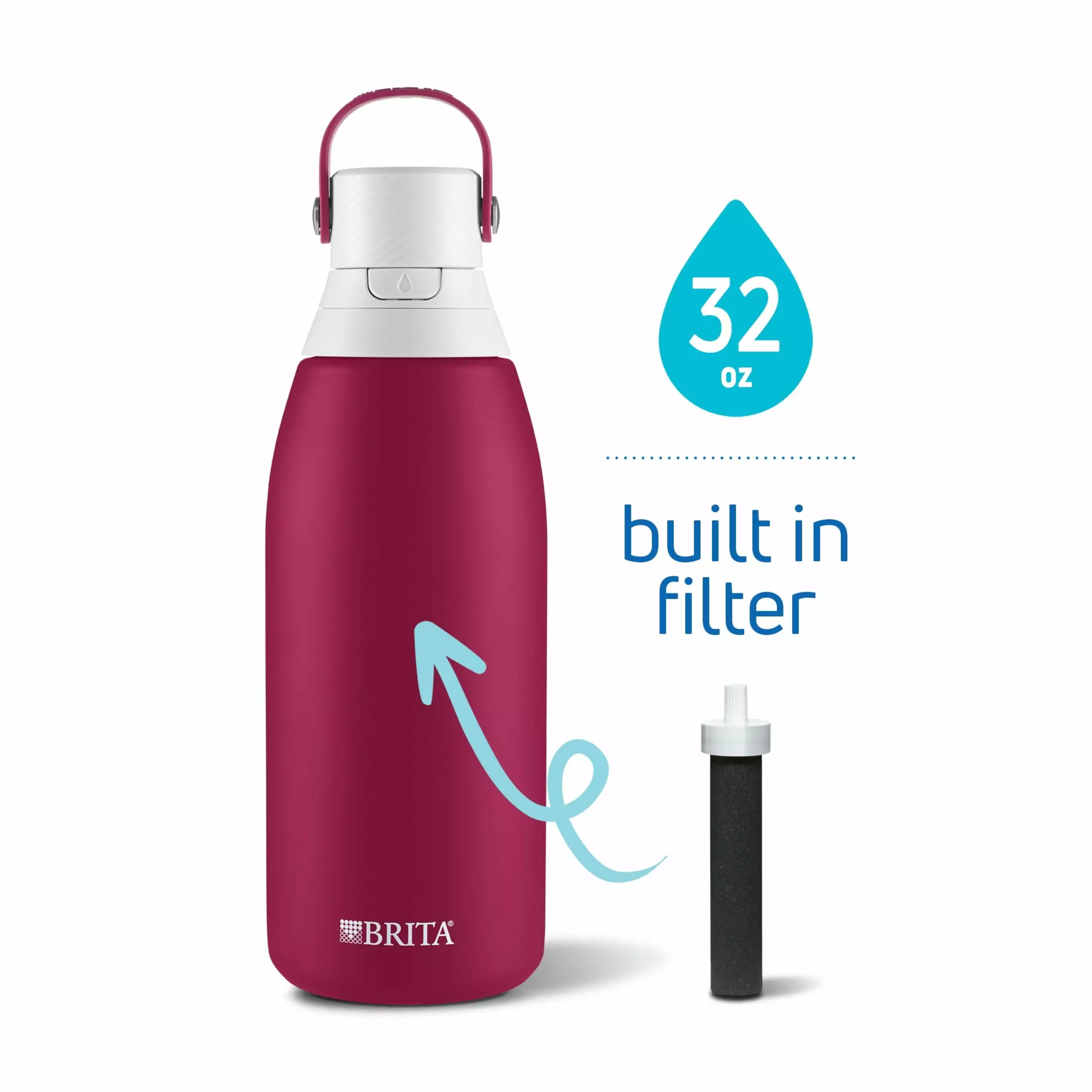 Enjoy great-tasting water anywhere with the Brita® 32 Ounce Stainless Steel Premium Filtering Water Bottle. The durable. double wall insulated bottle stays cold for a full 24 hours. It includes 1 replaceable filter. which reduces Chlorine (taste & odor) as you drink. Featuring an enclosed. easy-sip straw. built-in carrying loop for grab-and-go portability. and one-handed push button lid. this bottle is designed for effortless convenience. The bottle has a leak-proof design to help you avoid surprise drips and spills. Enjoy hassle-free hydration anywhere: at home. the office. a sporting event. or at the gym. One Brita® water filter can replace 300 standard 16.9 ounce single-use plastic bottles each year. so you can stay hydrated. save money. and reduce plastic waste. For best results. replace the filter every 40 gallons or about every two months. With Brita®. take filtered water anywhere you go!