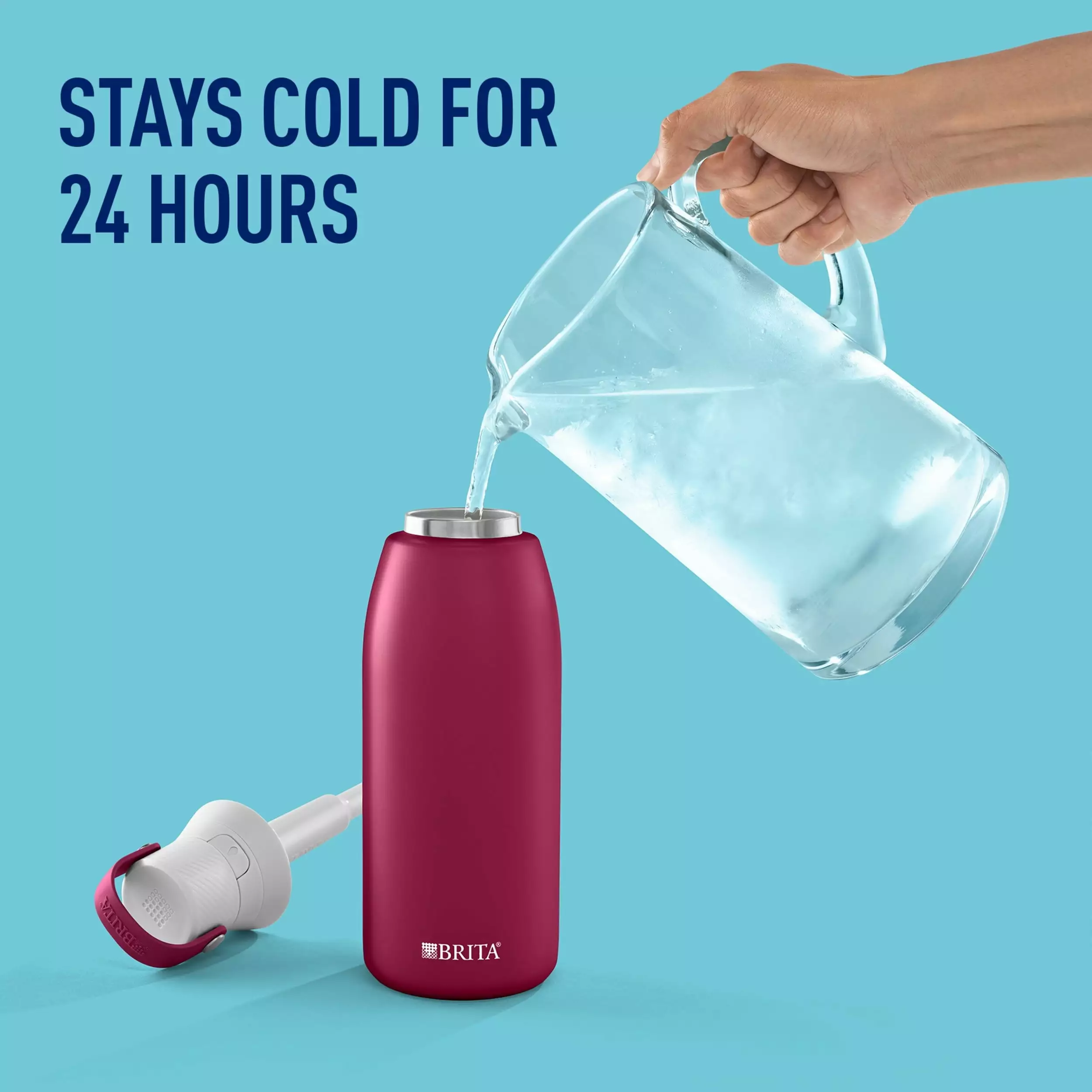 - Brita’s Premium Filtering stainless steel bottle holds 32 oz of water. and is designed with a Brita filter that fits in the straw that makes water taste great and keeps water cold for 24 hours