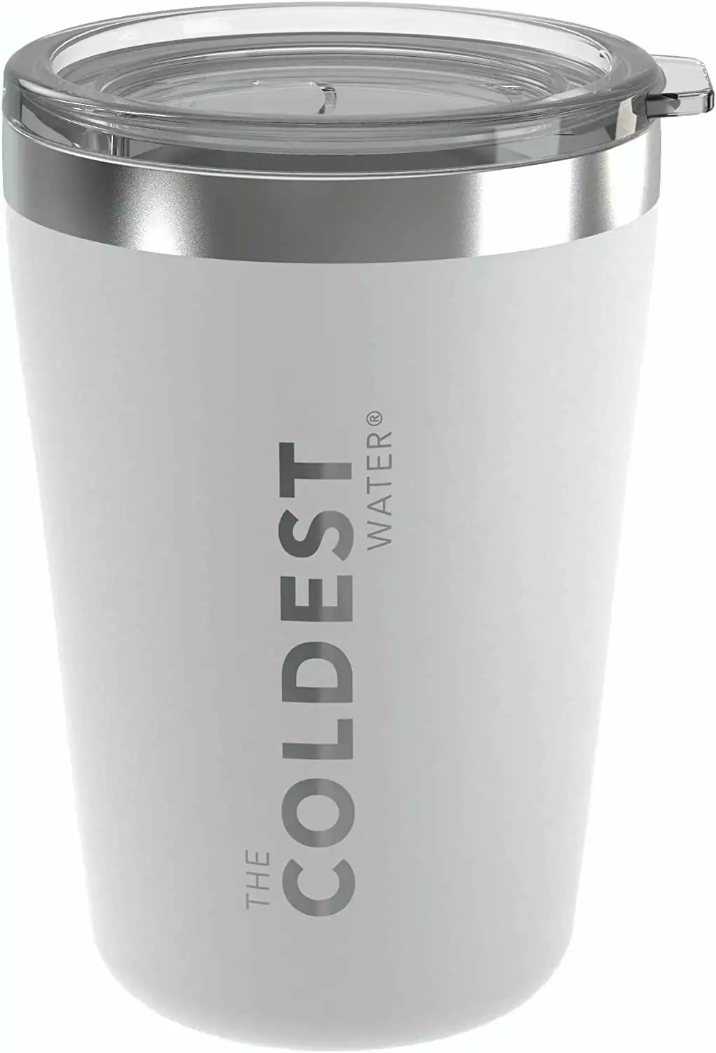 The Coldest Water Premium Tumbler Cup (12 Oz Stainless Steel Travel Mug) was built with our coffee drinkers in mind. This 12oz Tumbler (Epic White) will keep your drink hot or cold (travel mug for hot and cold beverages) at least 3x longer than a regular cup (Coffee Mug to Keep Ice Cold). Take it on the go. with the narrowed bottom that fits in 99% of cup holders (Super Cold Thermal Cup). Sliding tab lid keeps your drink inside. not out. Great for hot or cold drinks (Cups hot and cold). ice cream. cereal on the go. or your beer at the beach. Fit large ice cubes for your cold drinks (Thermos for hot coffee). and be rest assured that our double stainless steel walled tumbler will be your new favorite travel cup.