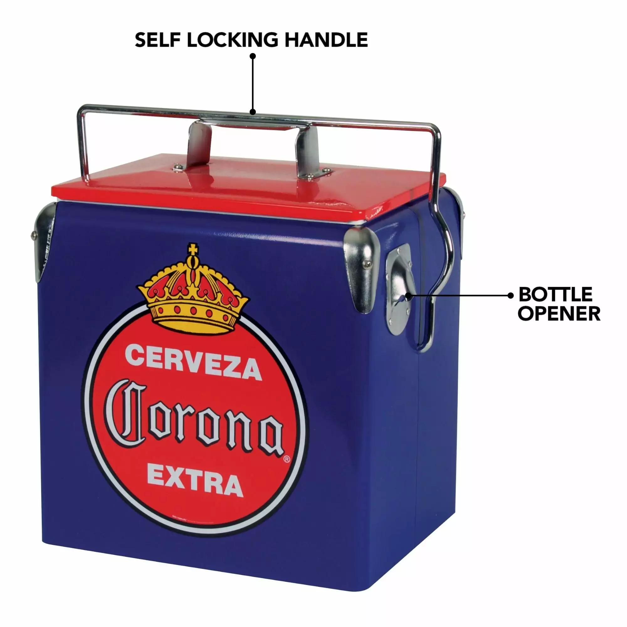 Show off your cool vintage style and celebrate your favorite beer – This retro style steel-belted ice chest features licensed Corona graphics. eye-catching blue and red exterior. and polished chrome accents. making it the perfect accessory for the beach. patio. campsite. boat. cottage. or RV. Fill up the insulated cooler with ice and pre-chilled drinks and snacks for environmentally friendly safe storage with no electricity or CFCs. Self-locking lid and durable non-toxic plastic liner trap cold air inside for maximum efficiency and built-in bottle opener means no scrambling for your opener when you want a cold one!