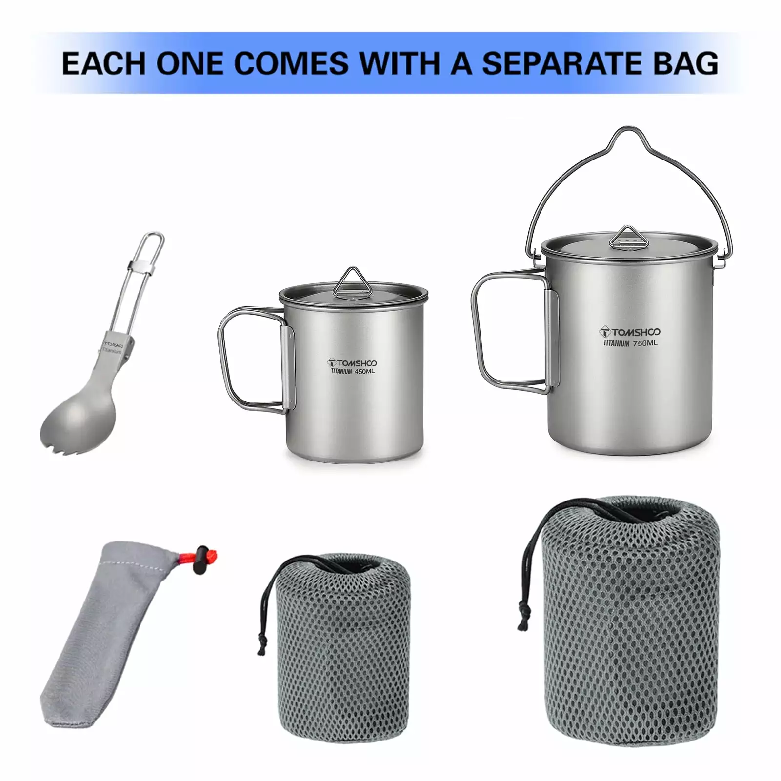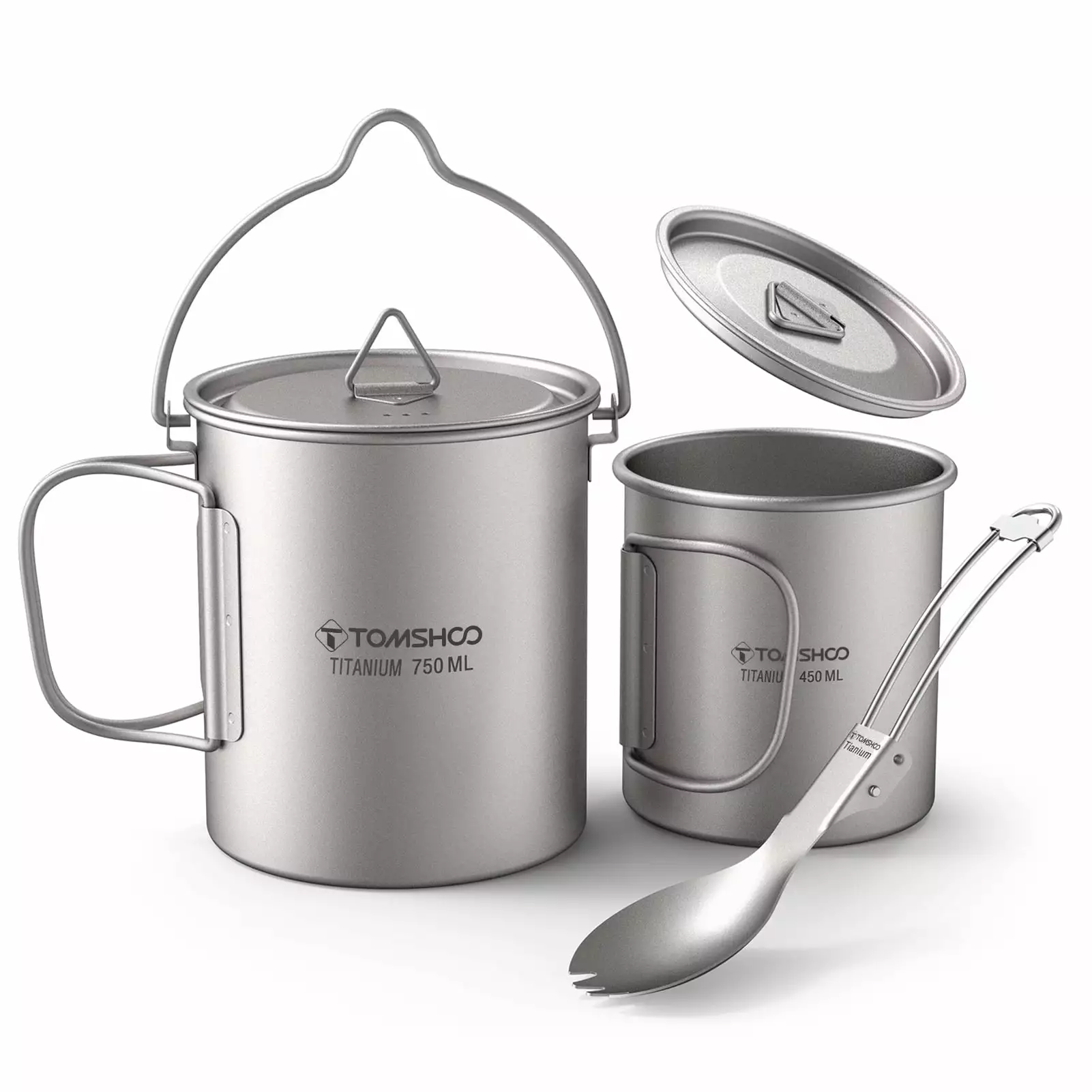 - 3 Pieces Set: Full titanium set includes a 750ml pot. 450ml cup and a folding spork. great for camping. hiking. backpacking. outdoor adventure and survival.