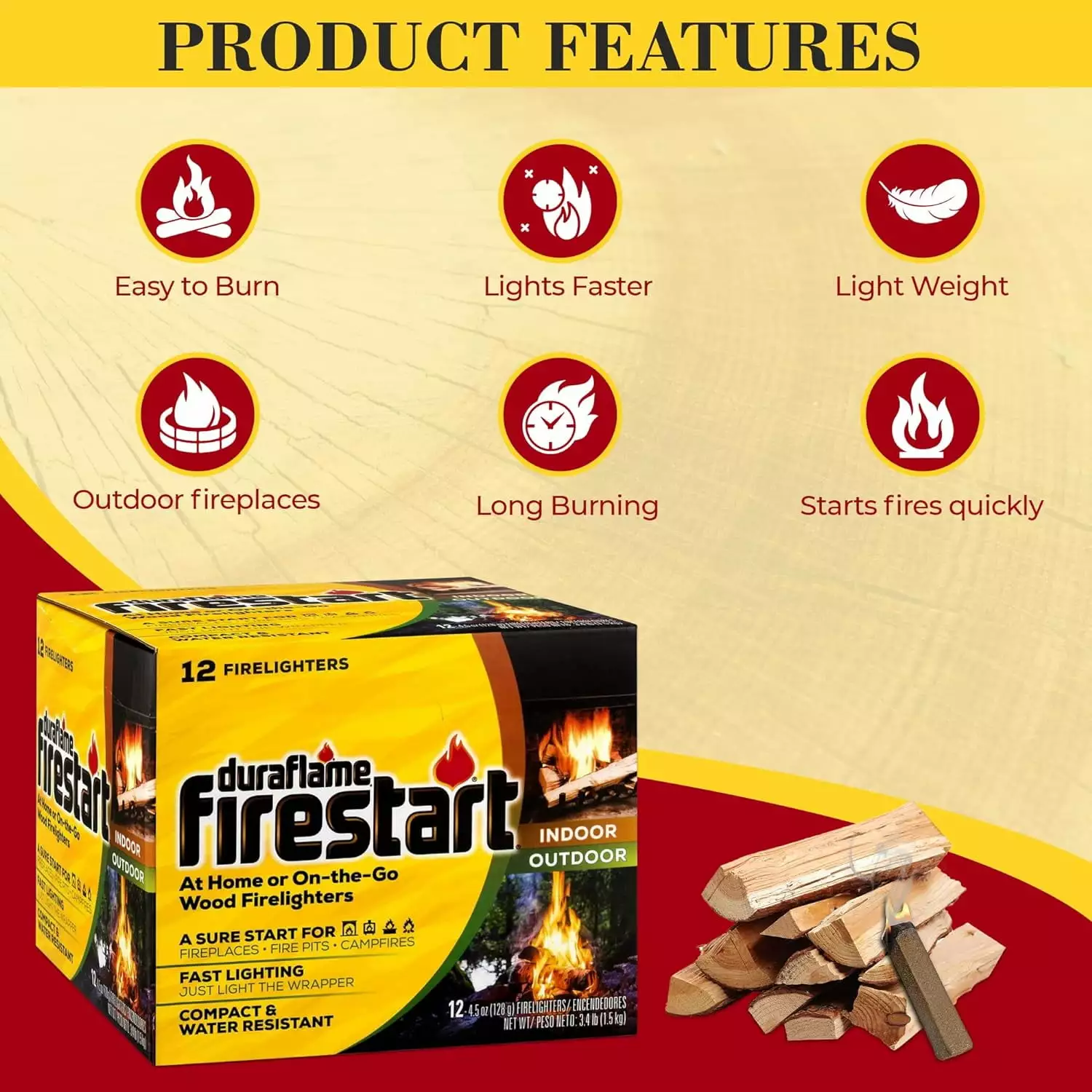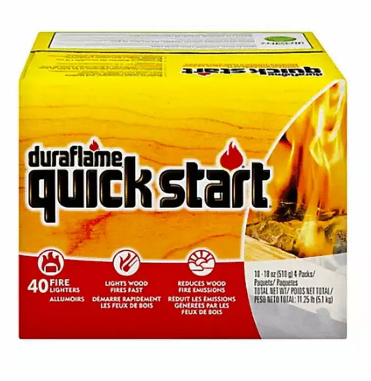 Duraflame Firestart Firelighters are the fast. sure way to start a wood fire at home or on-the-go. They’re compact and paper-wrapped for portability. clean handling and easy lighting. Versatile firelighter quickly starts any wood fire at home or on-the-go. A sure start for fireplaces. fire pits and campfires. Just light the wrapper – individually wrapped for easy lighting. One firelighter burns up to 30 minutes. long enough for even difficult wood fires. Compact and water resistant. perfect to take along on camping trips. 12 Count; Size: 4.5 ounce; Easily start your wood fires in fireplaces. wood stoves. fire pits. and campfires; Just light the wrapper; Compact – Perfect to take along on camping trips; Individually wrapped in water resistant wrappers; 30 minute burn time starts any wood fire.;