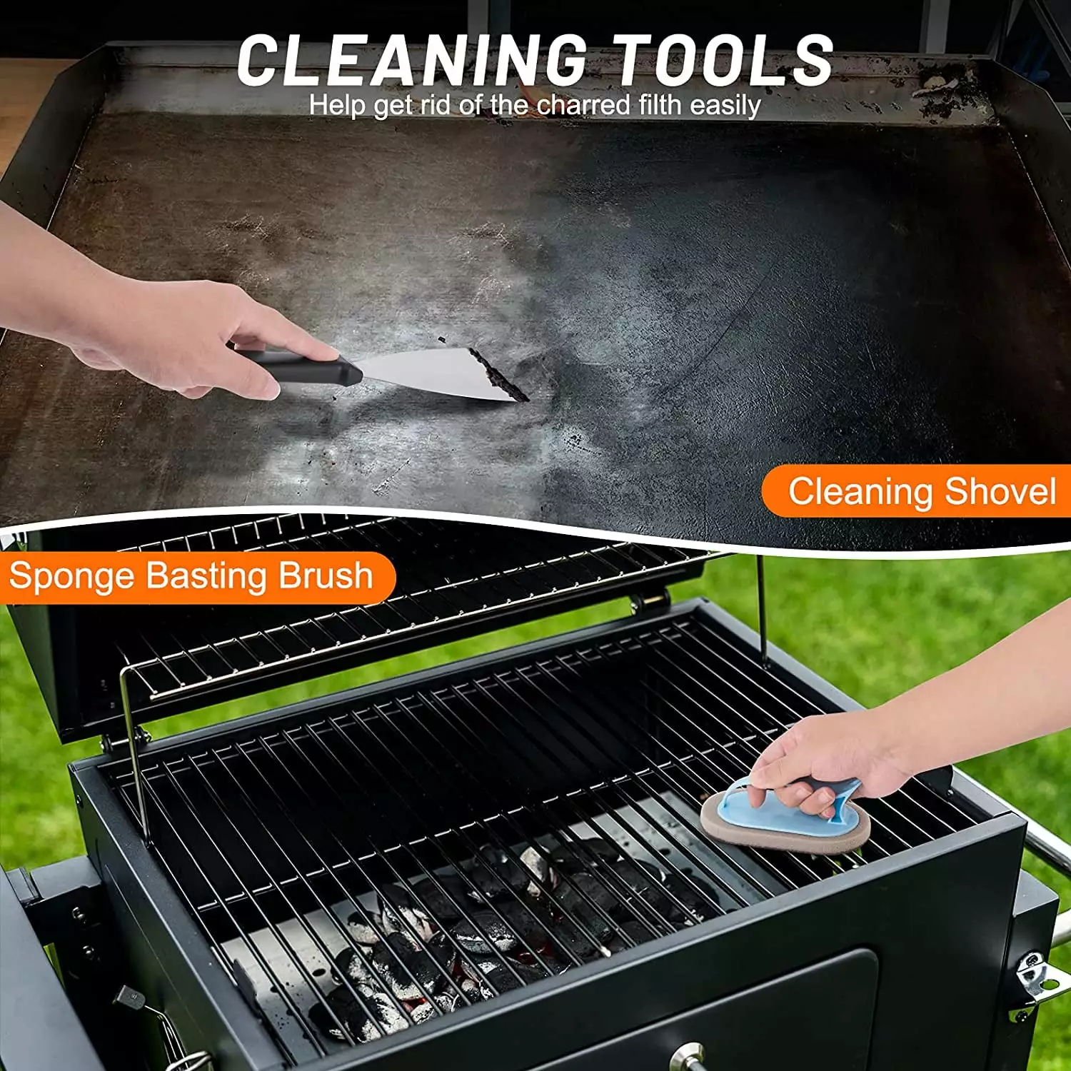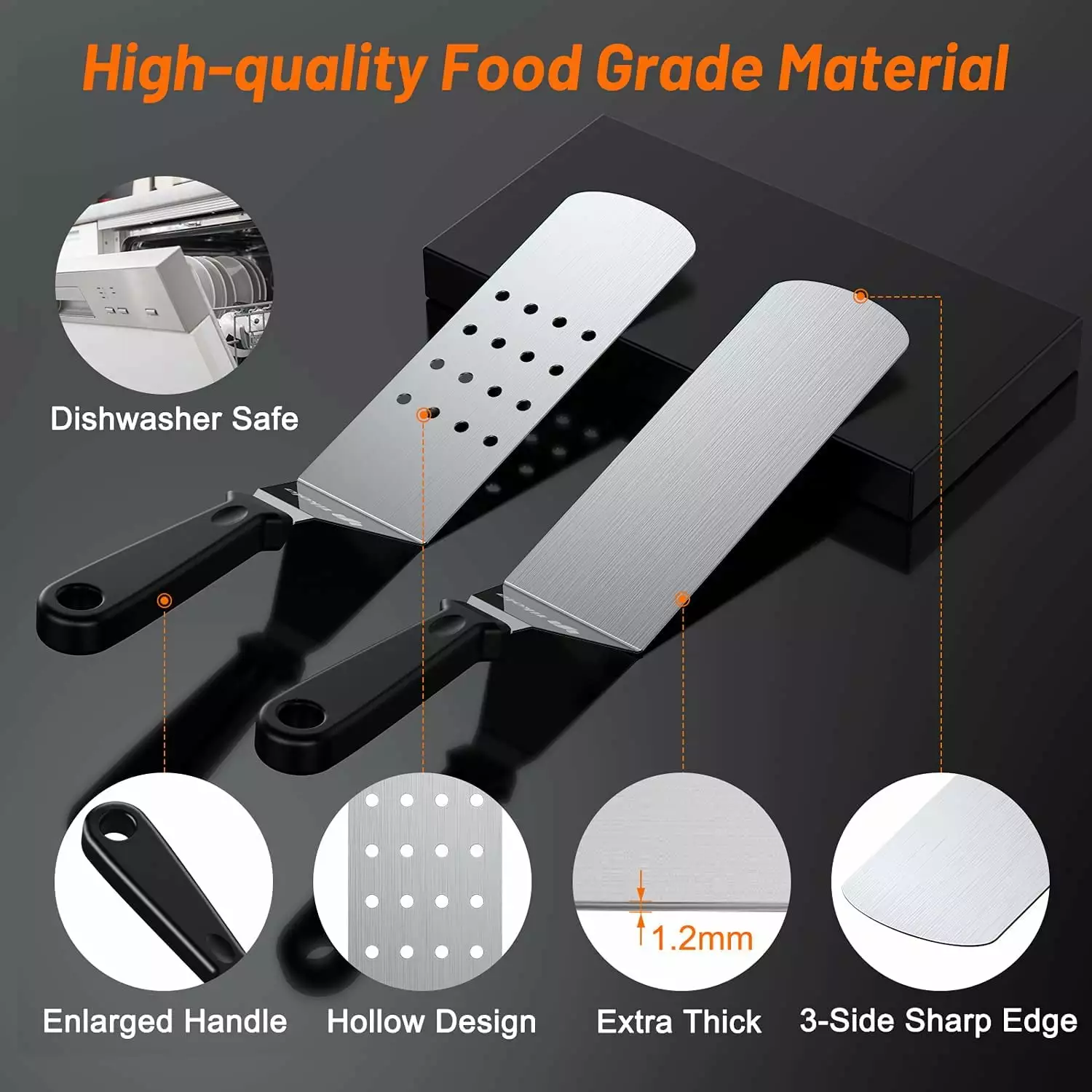 - ??Food Grade High-quality Material?? All the tools in this griddle accessories for blackstone are made of healthy and safe material and totally reach the food safety grade which can contact with the food directly. Also. the durable material makes the service life longer. The stainless steel part is smooth for frying and flattening the food better. The PP material and extra large size handle is non-slip and heat resistant to prevent burns.