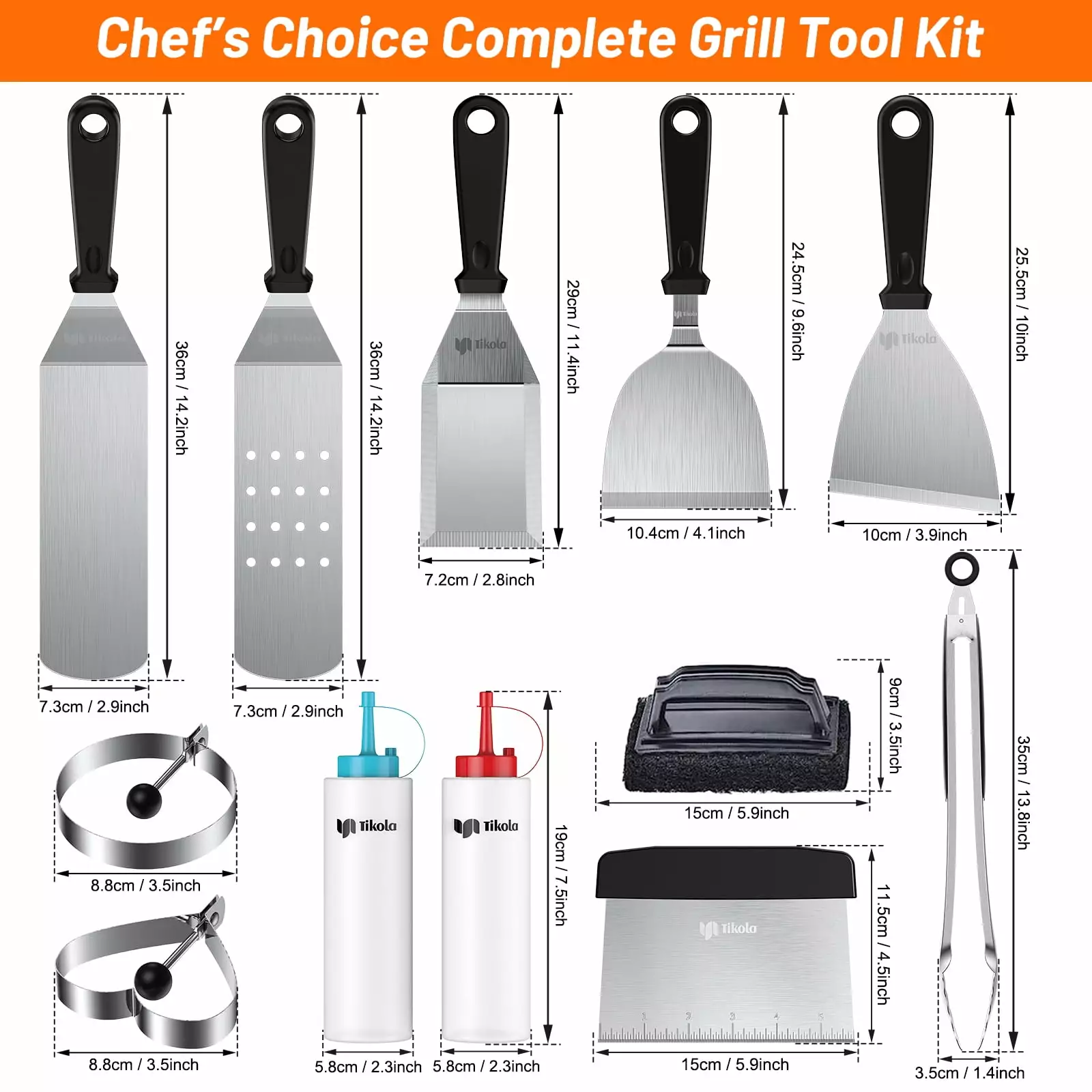 - ??A Perfect Gift Set Choice?? This griddle accessories for blackstone includes: 2* oversize spatulas. 2* barbecue spatulas. 1* graduated chopping scraper. 2* sauce bottles. 1* cleaning spatula. 1* cleaning brush. 1* dry pan tong. 2* egg rings (3.5). 1* carrying bag. This griddle accessories for blackstone can be a perfect gift set for all BBQ or cooking lovers. Absolutely the Ideal gift choice for Father’s Day. Thanksgiving or Christmas. Enjoy the BBQ time with your family or friends at home. rooftop or campsites.