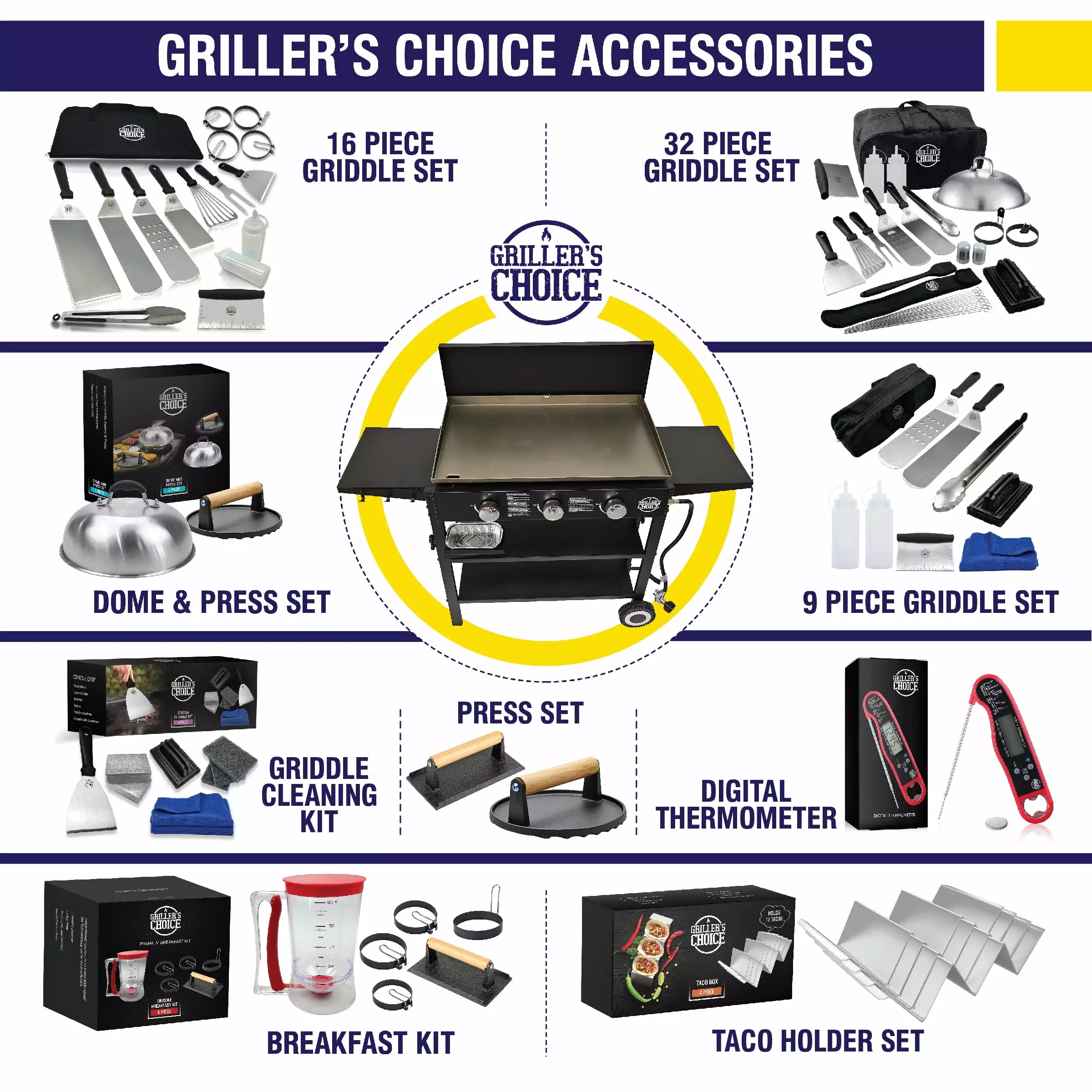Welcome to the ultimate grilling experience with Griller’s Choice Dome and Press Set – your indispensable flat grill accessories. This set is a must-have for grillers. cooks. griddle grill enthusiasts. and everyone who loves outdoor cooking. It’s perfect for camping. entertaining. and even for your daily cooking needs. The set includes a durable cast iron smash burger press and a stainless steel dome. The cast iron press doubles as a superb griddle press for smash burgers and a bacon press for the griddle. It’s designed to give you that perfect burger smasher tool experience. creating mouth-watering burgers that your friends and family will love. The smash burger press. crafted from cast iron. is your ultimate smashburger press. Whether you’re making a classic burger or experimenting with a Japanese burger recipe. this press will deliver excellent results every time. The press also serves as a final press. providing the finishing touch to your burger. ensuring it’s cooked evenly and to perfection. The steaming dome is another reason why this set stands out. It’s not just a griddle dome cover; it’s also a melting dome. perfect for melting cheese on your burgers or grilling vegetables. Made from stainless steel. the dome traps heat efficiently. reducing cooking time and improving the taste of your food. And let’s not forget the additional uses that make this set a versatile cooking tool. The hamburger press for the griddle can be used as a ham press. while the dome can also function as a grill dome. and the iron press as a cooking press. So. why wait? Improve your grilling game today with this all-in-one Griller’s Choice Dome and Press Set. Whether you’re a seasoned griller or just starting out. this set is a game-changer. Plus. it makes a great gift for any grilling enthusiast or aspiring cook. Remember. the best meals are the ones made with love… and the right tools!