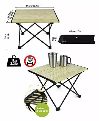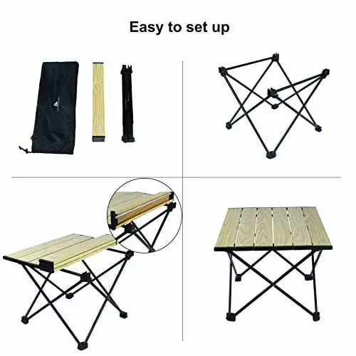 - Compact. packed size 15.75 ?? 5.9 ?? 2.76 inches; carry bag included. easy to carry everywhere; Unlike normal cloth tables. this table has flat surface; Surface area 16.14 ?? 13.78 inches; Height 11.42 inches; Heat resistant. can put your stove on; Very easy to set up. just open the base frame and attach the table top. enjoy your leisure time in seconds