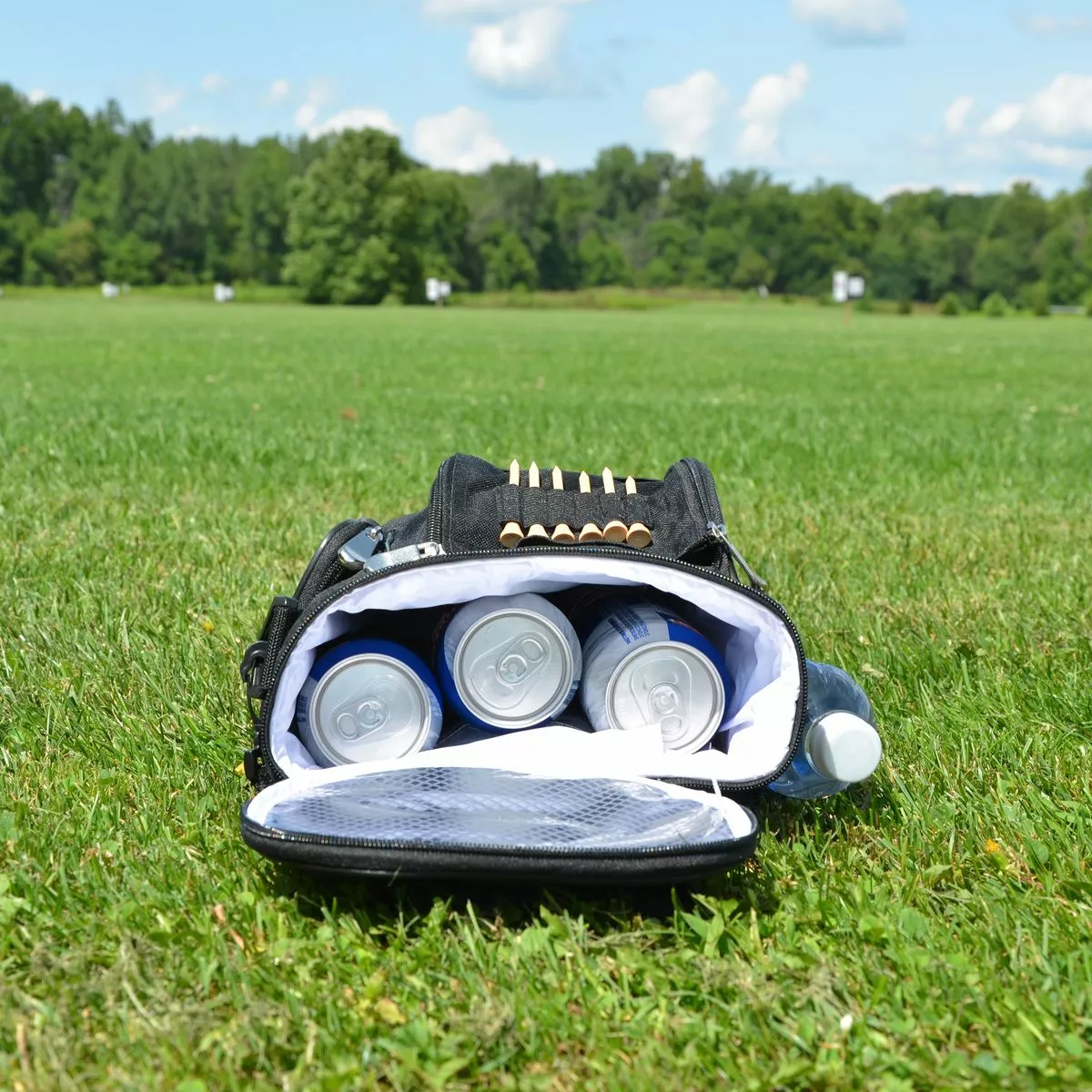 Keep hydrated and store your valuables with the Intech Golf Bag Cooler & Accessory Caddy. Capable of holding ten 12-ounces cans plus ice. plus also features an insulated liner. side mesh bottle holder. tee holder. zippered side pocket and larger zippered front pocket to hold your valuables. The padded top and extra long strap make it easy to transport or can be clipped or strapped to your golf bag or cart.STAY HYDRATED – The Intech insulated cooler bag holds up to ten 12-oz cans plus ice. Perfect for a day at the golf course or driving range. Take it to the beach. picnics. camping. fishing. hiking. hunting. and other fun outdoor activities too..PLENTY OF STORAGE – Intech coolers offer two zippered pockets one large front pocket to store valuables like keys. wallet. glasses. and cell phone and a smaller sized pocket for snacks and golf accessories. There is an elastic golf tee holder in front..QUICK ACCESS – There is also a convenient side-mounted mesh bottle holder on the Intech golf cooler bag along with a metal ring to clip items onto such as a golf club cleaning brush or other golf accessories..PORTABLE COOLER – Intech s coolers are equipped with a padded top and long strap to make it easy to carry. Can be clipped or strapped onto a golf push cart or fit into the basket on a golf cart..COMPACT SIZE – Measures 12 inches tall x 9.5 inches long x 7 inches wide. This soft cooler bag is made with a heavy-duty jacquard fabric for long lasting durability. Best to stack cans vertically to maximize space.