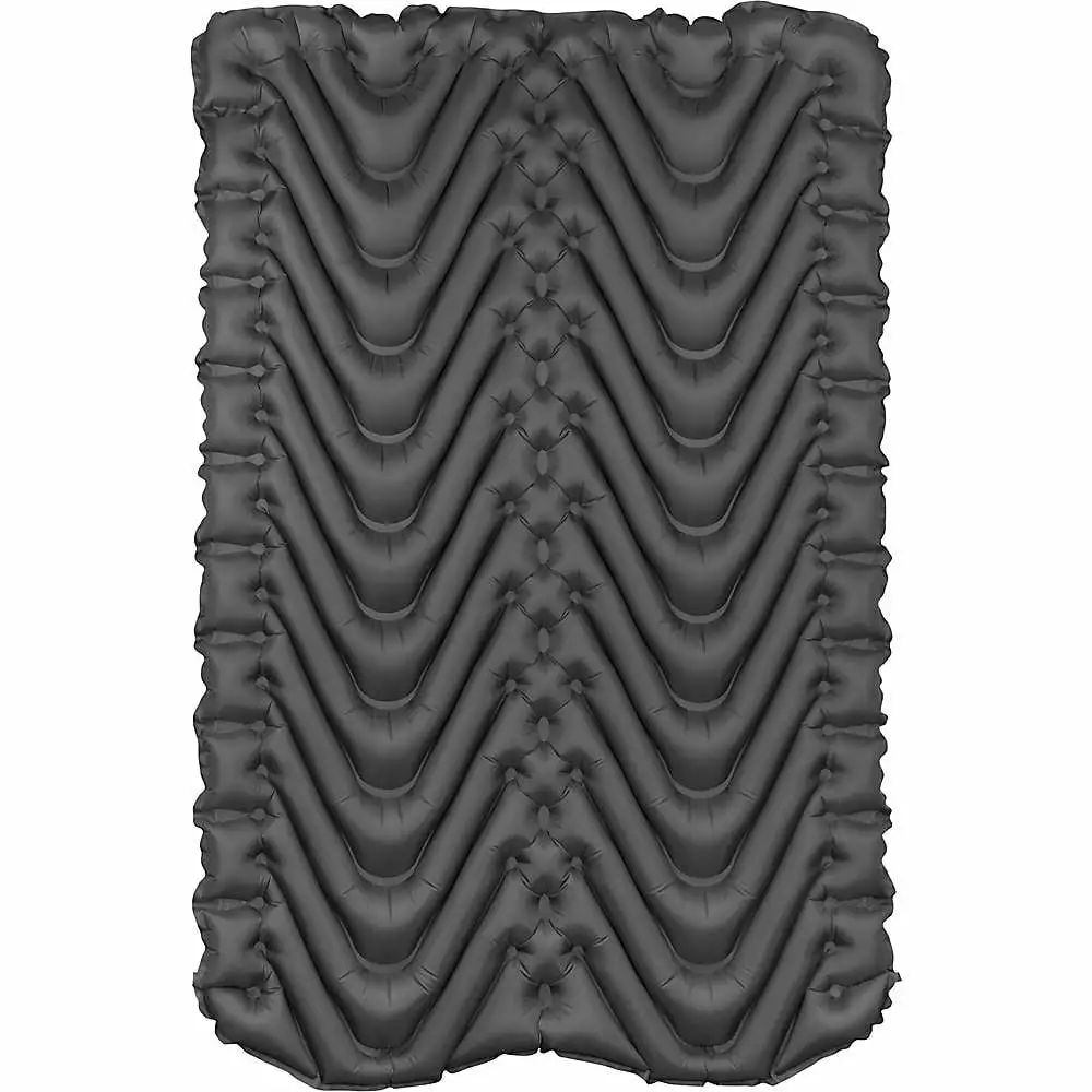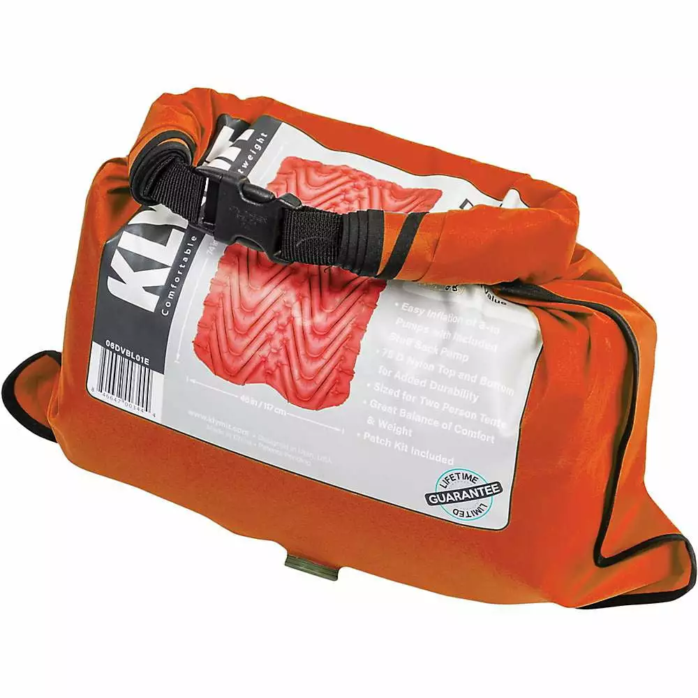 Klymit Insulated Double V Sleeping Pad. 74in x 47in x 3in. Red. Side-by-side V-Chamber construction limits movement of air between the two sides. Klymalite insulation isolates warmer air to the top of the pad. Comes with pump-integrated stuff sack for easy. rapid inflation. Inflates with 10 pumps from stuff sack.