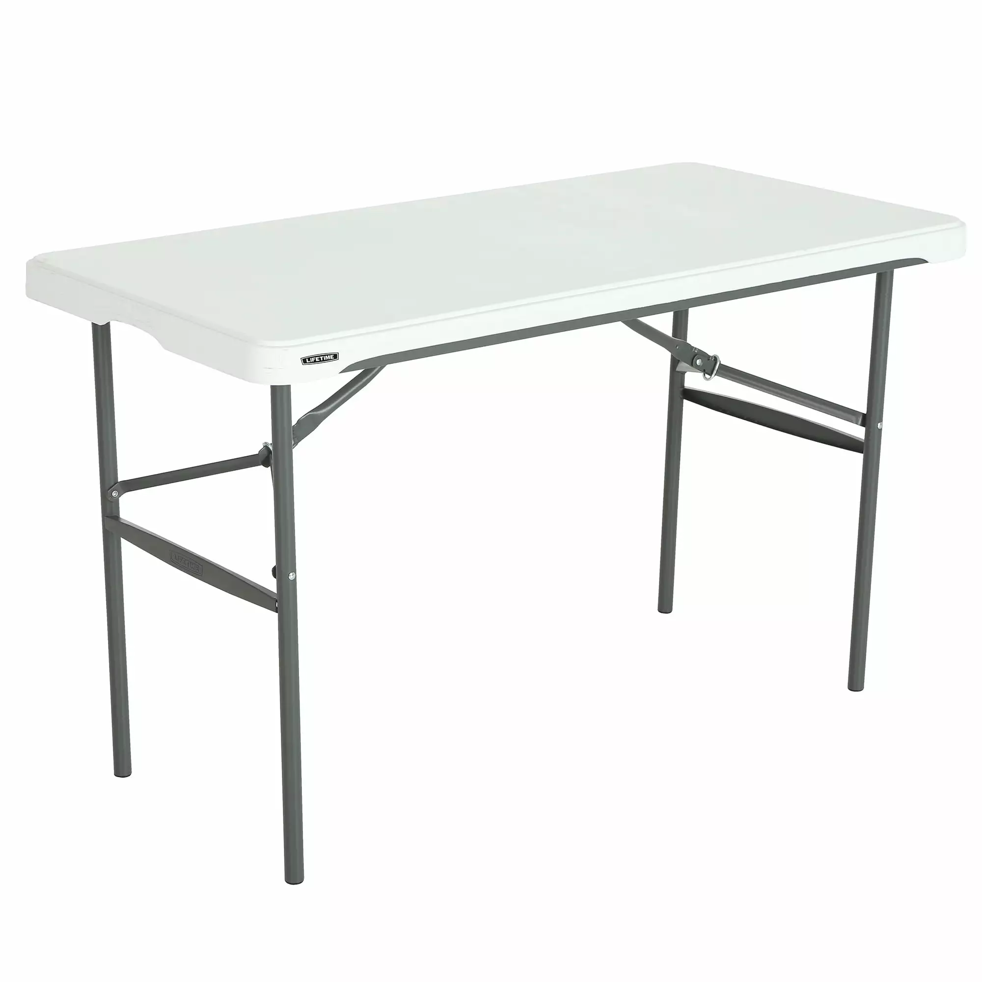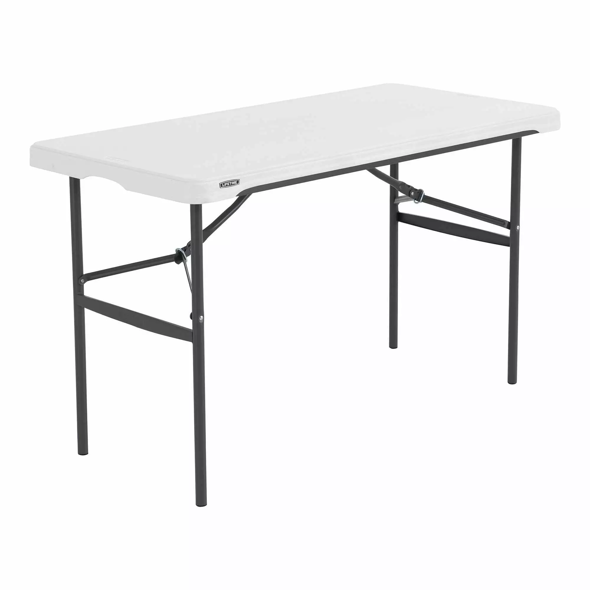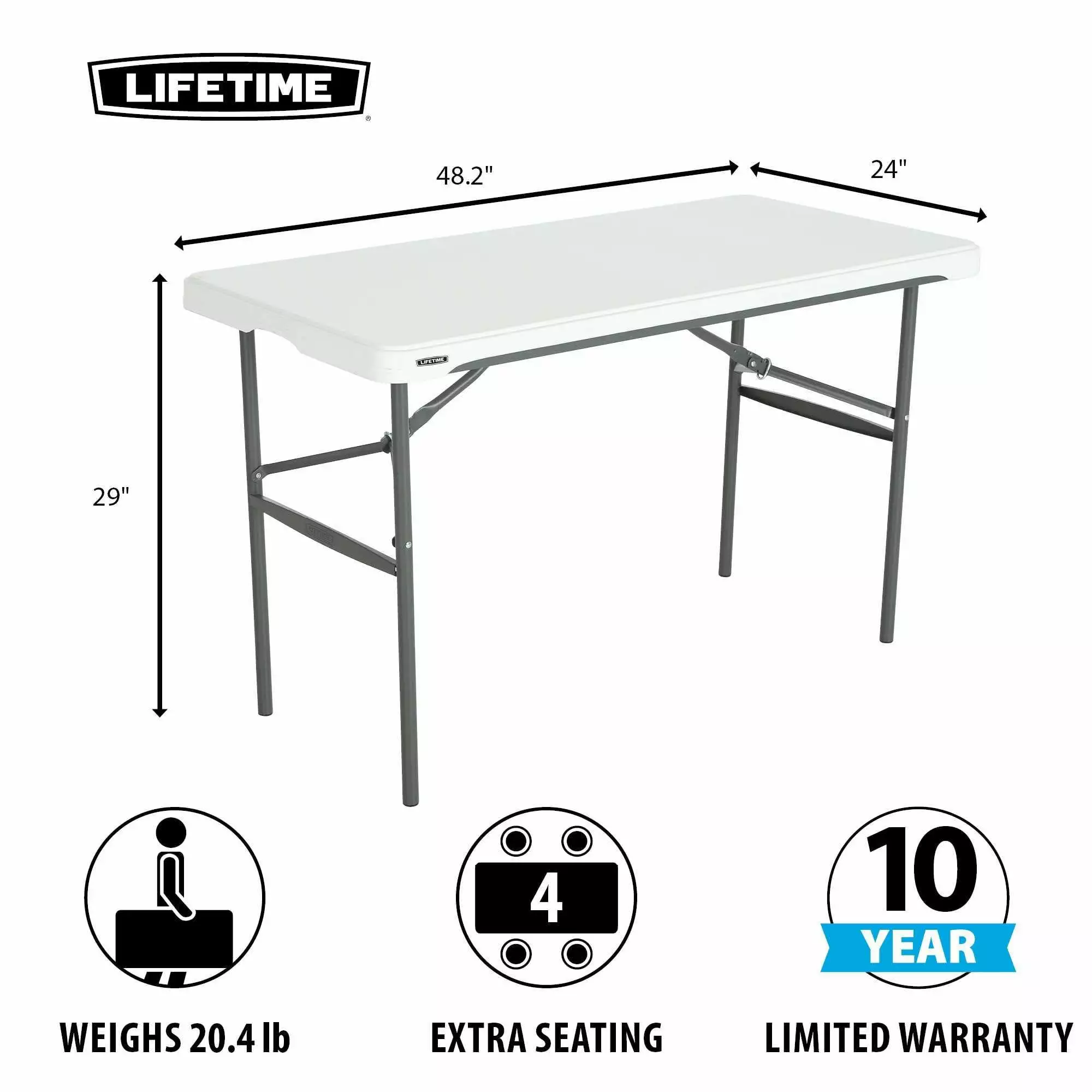 Lifetime 4-Foot Commercial Nesting Folding Table – Features a 48 in. x 24 in. molded tabletop (white granite) with a round folding frame (gray). This table is made with High Strength Low Alloy (HSLA) steel. and has a nesting design that allows tables to stack together. 10-year limited warranty.Lifetime 4-Foot Nesting Table Features