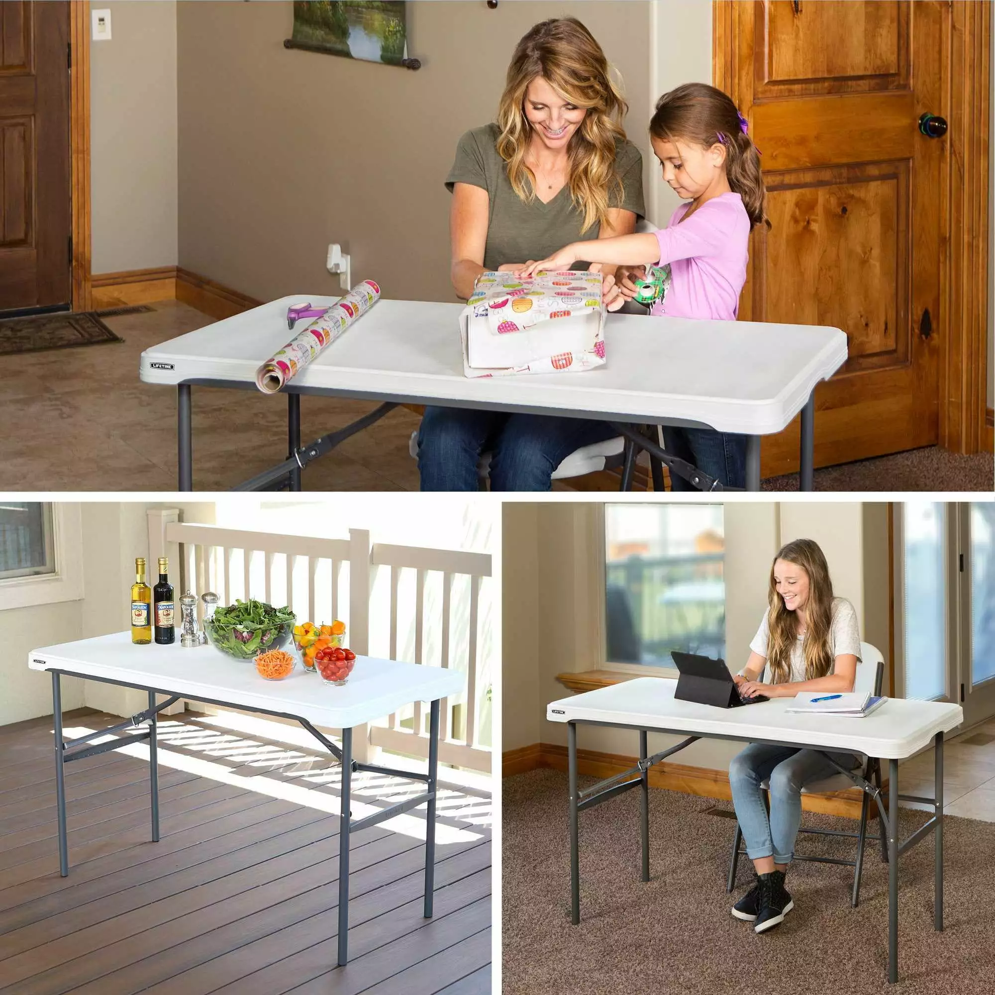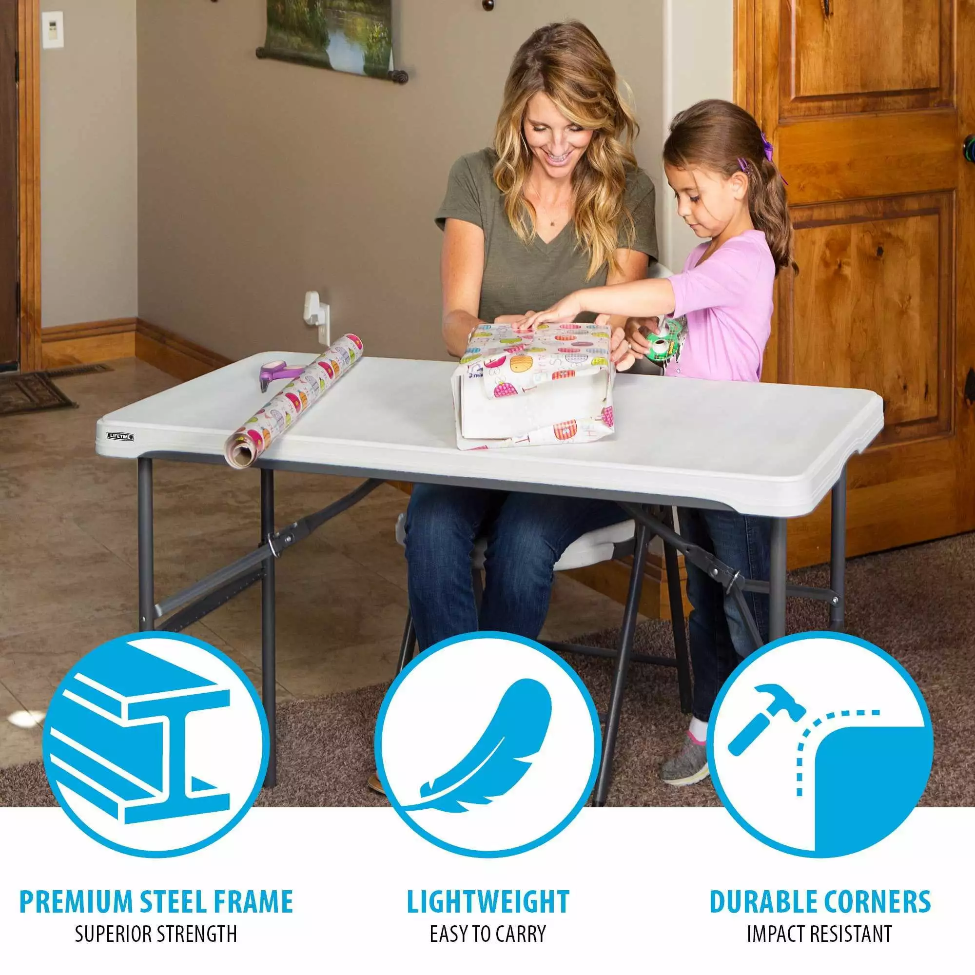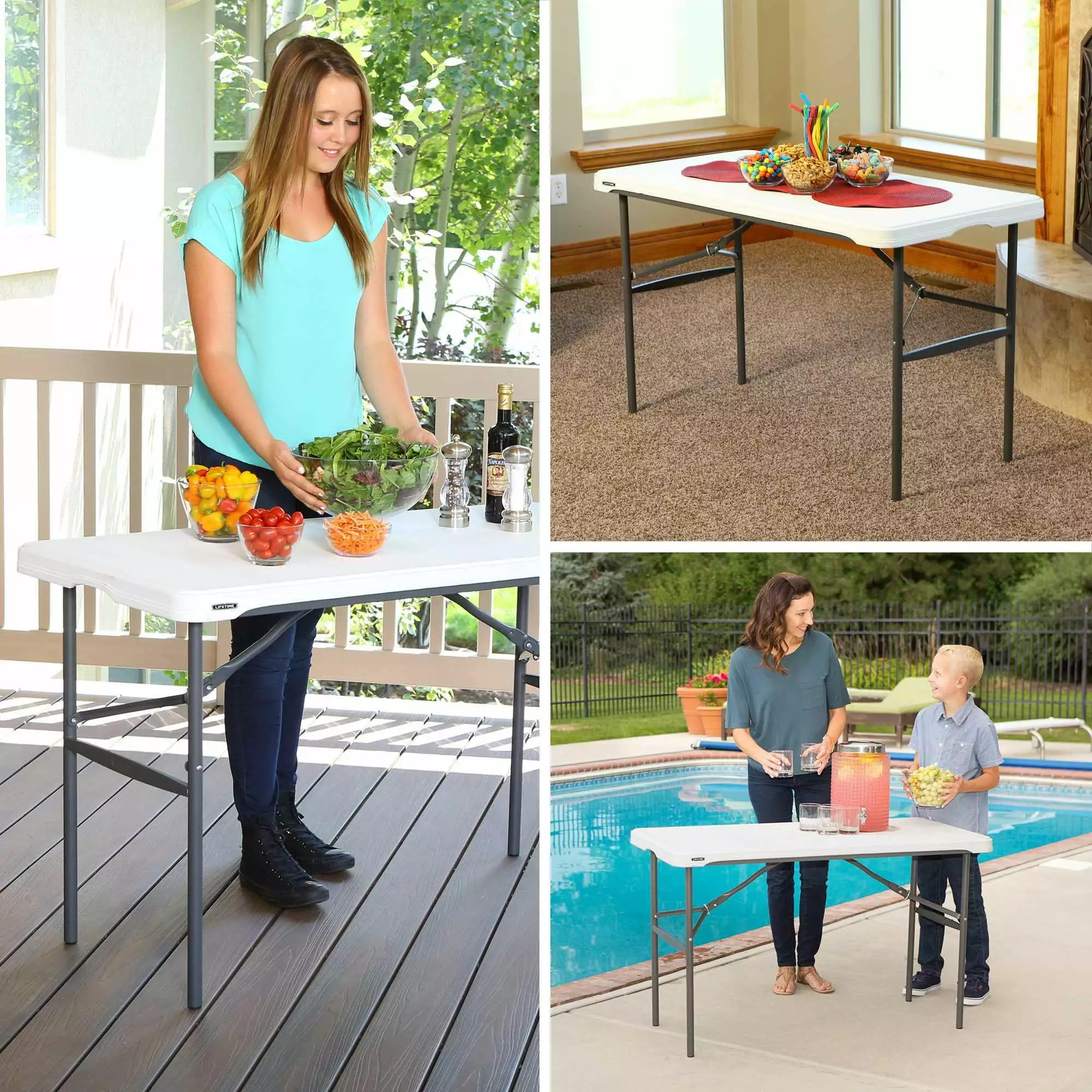 Lifetime 4-Foot Commercial Nesting Folding Table – Features a 48 in. x 24 in. molded tabletop (white granite) with a round folding frame (gray). This table is made with High Strength Low Alloy (HSLA) steel. and has a nesting design that allows tables to stack together. 10-year limited warranty.Lifetime 4-Foot Nesting Table Features