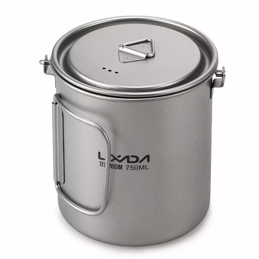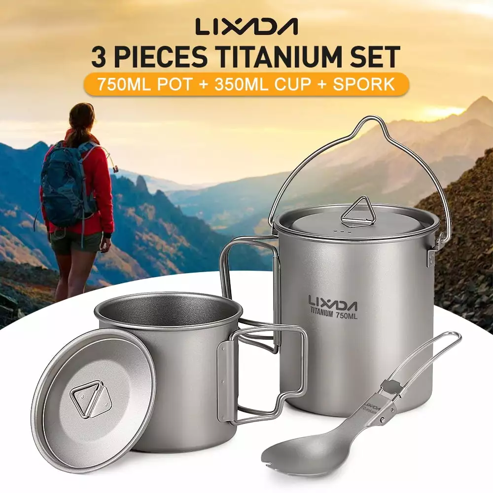 - 3 Pieces Set: Full titanium set includes a 750ml pot. 350ml cup and a folding spork. great for camping. hiking. backpacking. outdoor adventure and survival.
