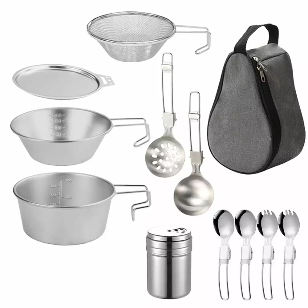 This is a 3-piece set that includes a 750ml pot. 350ml cup and a spork. The full kit is made of durable . lightweight and corrosion-resistant. Pack the kit in the included storage sack and stuff in your backpack. your trip will be more convenient and enjoyable.